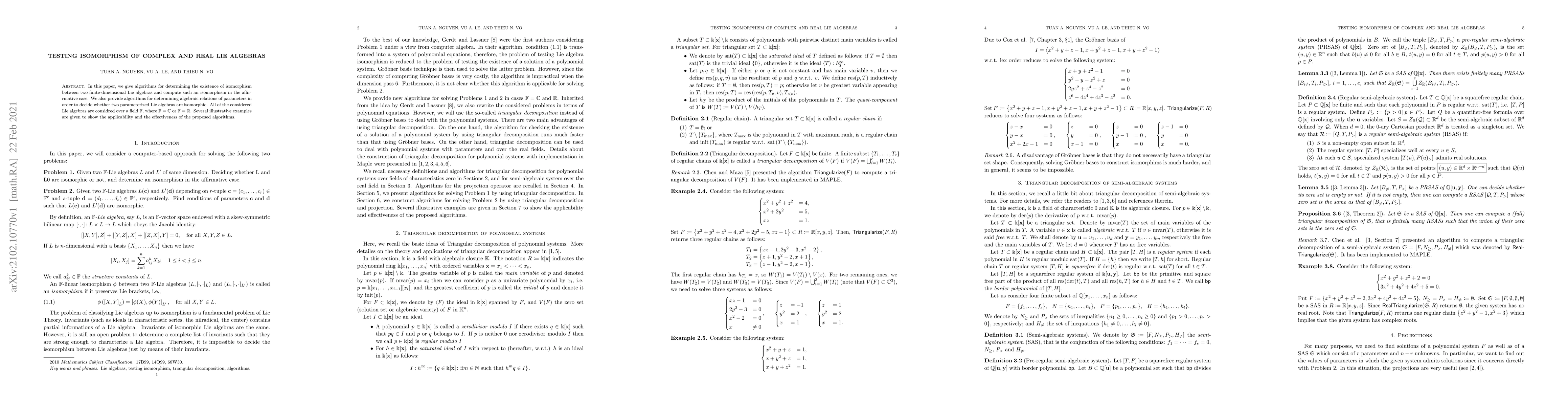 In this paper, we give algorithms for determining the existence of isomorphism between two finite-dimensional Lie algebras and compute such an isomorphism in the affirrmative case. We also provide algorithms for determining algebraic relations of parameters in order to decide whether two parameterized Lie algebras are isomorphic. All of the considered Lie algebras are considered over a field $\F$, where $\F=\C$ or $\F=\R$. Several illustrative examples are given to show the applicability and the effectiveness of the proposed algorithms.