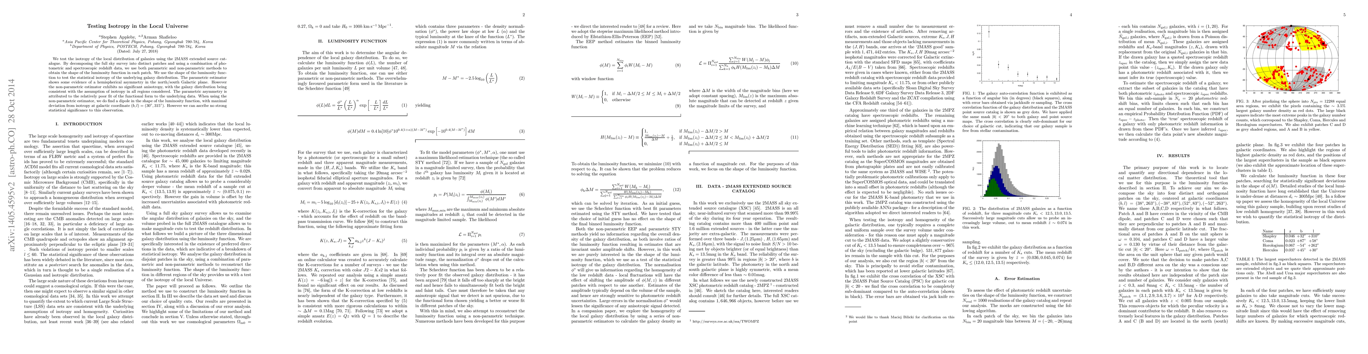 We test the isotropy of the local distribution of galaxies using the 2MASS extended source catalogue. By decomposing the full sky survey into distinct patches and using a combination of photometric and spectroscopic redshift data, we use both parametric and non-parametric methods to obtain the shape of the luminosity function in each patch. We use the shape of the luminosity function to test the statistical isotropy of the underlying galaxy distribution. The parametric estimator shows some evidence of a hemispherical asymmetry in the north/south Galactic plane. However the non-parametric estimator exhibits no significant anisotropy, with the galaxy distribution being consistent with the assumption of isotropy in all regions considered. The parametric asymmetry is attributed to the relatively poor fit of the functional form to the underlying data. When using the non-parametric estimator, we do find a dipole in the shape of the luminosity function, with maximal deviation from isotropy at galactic coordinate $(b,l)=(30^{\circ},315^{\circ})$. However we can ascribe no strong statistical significance to this observation.