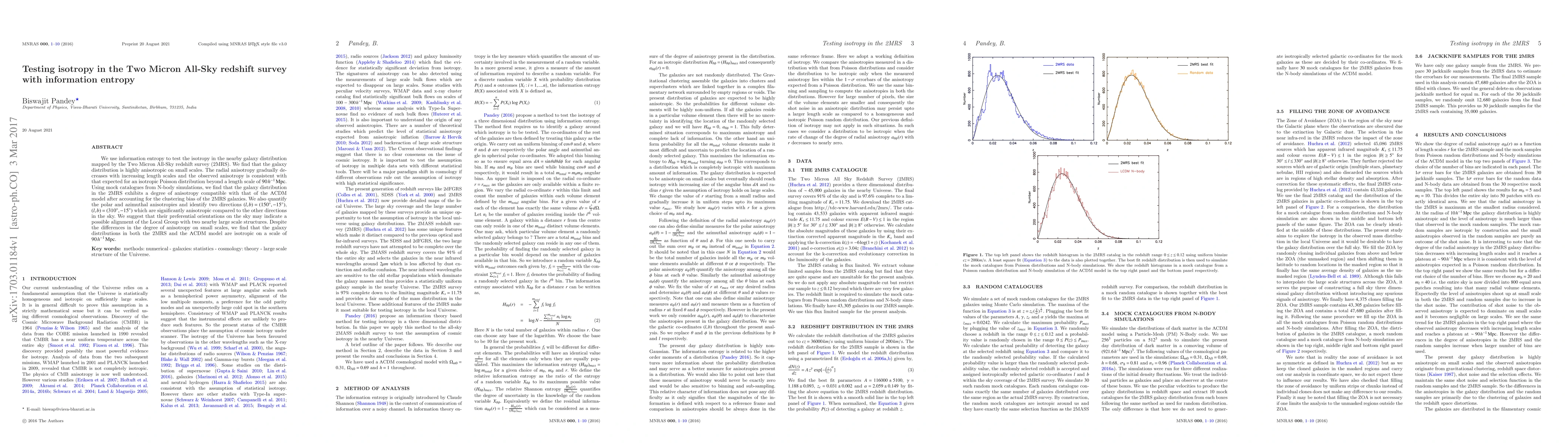 This paper uses information entropy to test isotropy in the Two Micron All-Sky redshift survey, finding significant small-scale anisotropy in the galaxy distribution. On larger scales, the anisotropy aligns with an isotropic Poisson distribution, suggesting alignment with the ΛCDM model and possible alignment of the Local Group with nearby large-scale structures.