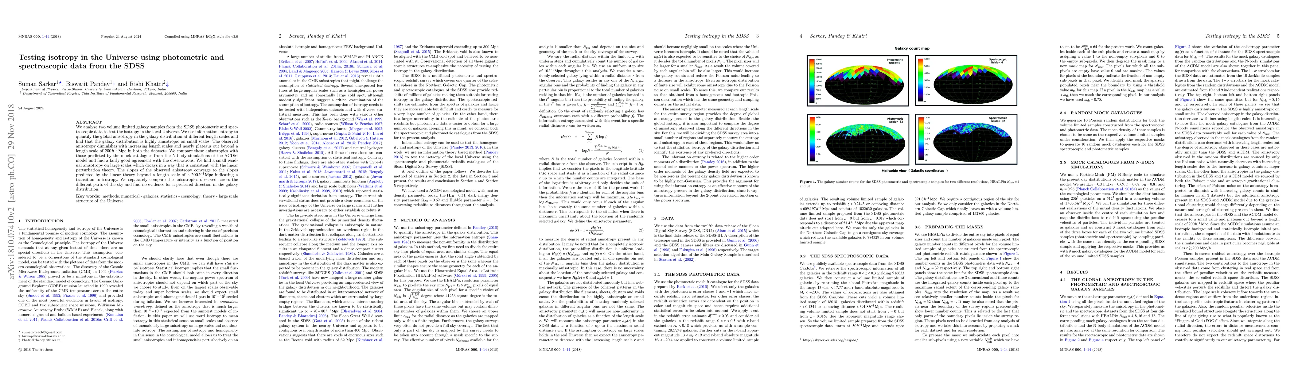 We analyze two volume limited galaxy samples from the SDSS photometric and spectroscopic data to test the isotropy in the local Universe. We use information entropy to quantify the global anisotropy in the galaxy distribution at different length scales and find that the galaxy distribution is highly anisotropic on small scales. The observed anisotropy diminishes with increasing length scales and nearly plateaus out beyond a length scale of 200 Mpc/h in both the datasets. We compare these anisotropies with those predicted by the mock catalogues from the N-body simulations of the Lambda CDM model and find a fairly good agreement with the observations. We find a small residual anisotropy on large scales which decays in a way that is consistent with the linear perturbation theory. The slopes of the observed anisotropy converge to the slopes predicted by the linear theory beyond a length scale of ~ 200 Mpc/h indicating a transition to isotropy. We separately compare the anisotropies observed across the different parts of the sky and find no evidence for a preferred direction in the galaxy distribution.