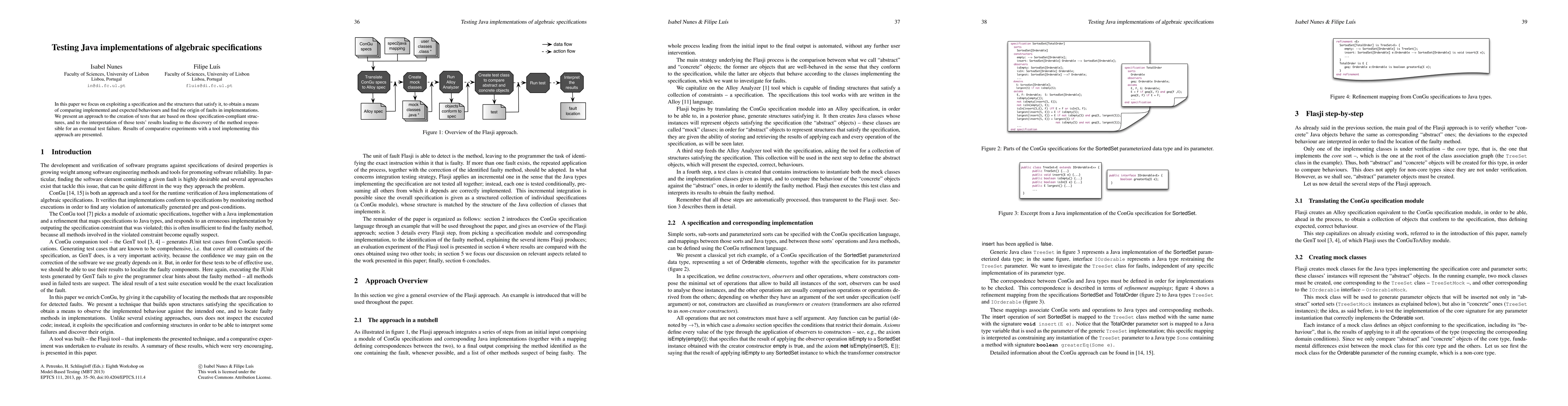 In this paper we focus on exploiting a specification and the structures that satisfy it, to obtain a means of comparing implemented and expected behaviours and find the origin of faults in implementations. We present an approach to the creation of tests that are based on those specification-compliant structures, and to the interpretation of those tests' results leading to the discovery of the method responsible for an eventual test failure. Results of comparative experiments with a tool implementing this approach are presented.