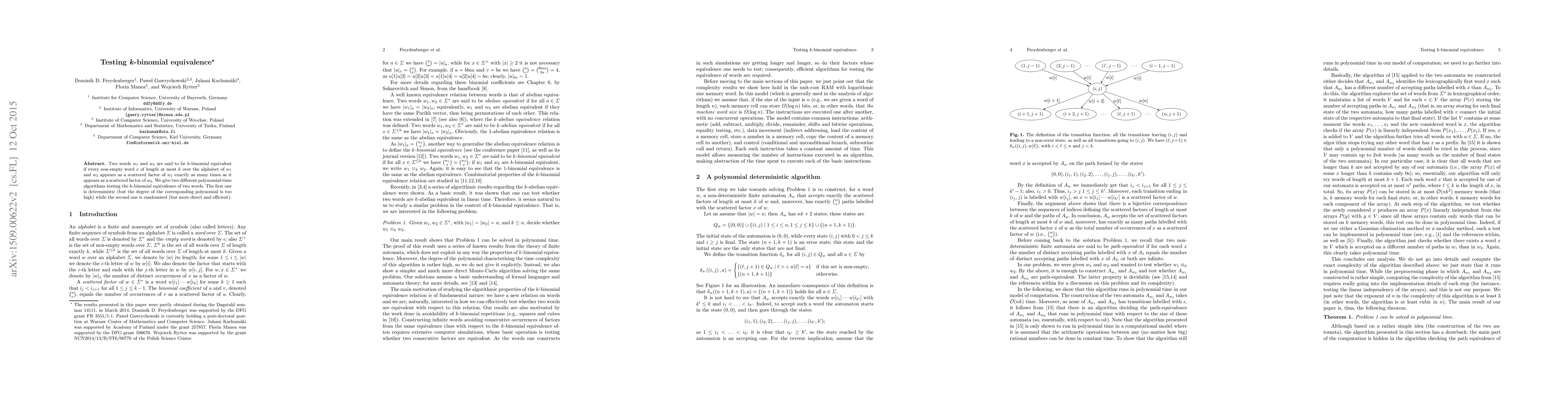 Two words $w_1$ and $w_2$ are said to be $k$-binomial equivalent if every non-empty word $x$ of length at most $k$ over the alphabet of $w_1$ and $w_2$ appears as a scattered factor of $w_1$ exactly as many times as it appears as a scattered factor of $w_2$. We give two different polynomial-time algorithms testing the $k$-binomial equivalence of two words. The first one is deterministic (but the degree of the corresponding polynomial is too high) and the second one is randomised (it is more direct and more efficient). These are the first known algorithms for the problem which run in polynomial time.