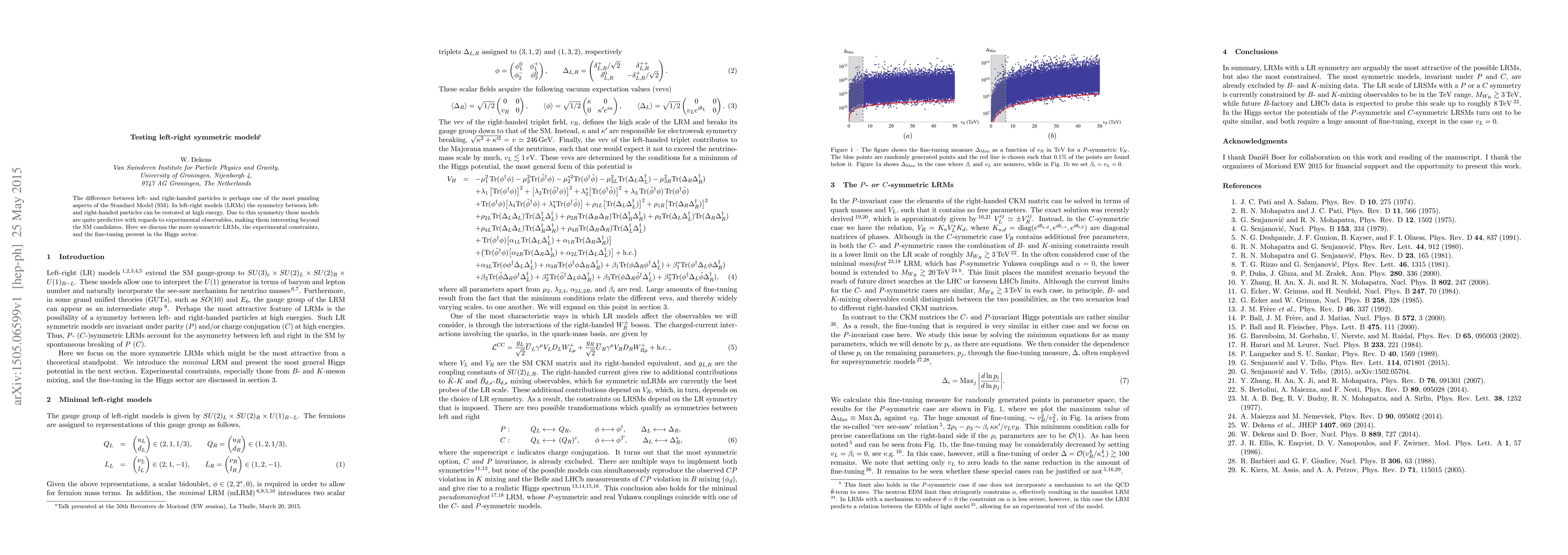 This paper explores left-right symmetric models (LRMs) that restore symmetry between left- and right-handed particles at high energy, offering predictive experimental insights beyond the Standard Model. It examines the experimental constraints and the fine-tuning issues in the Higgs sector of these models.