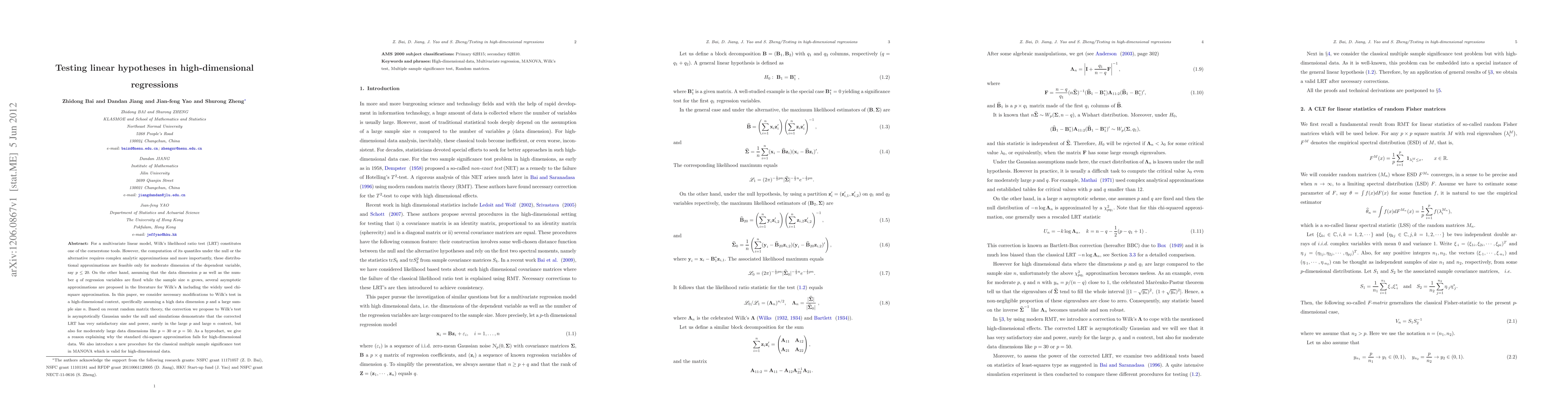 This paper proposes modifications to Wilk's likelihood ratio test for high-dimensional linear regressions, showing that the corrected test is asymptotically Gaussian and performs well in simulations, even for moderately large dimensions. It also explains why the standard chi-square approximation fails in high-dimensional settings and introduces a new MANOVA test procedure valid for such contexts.