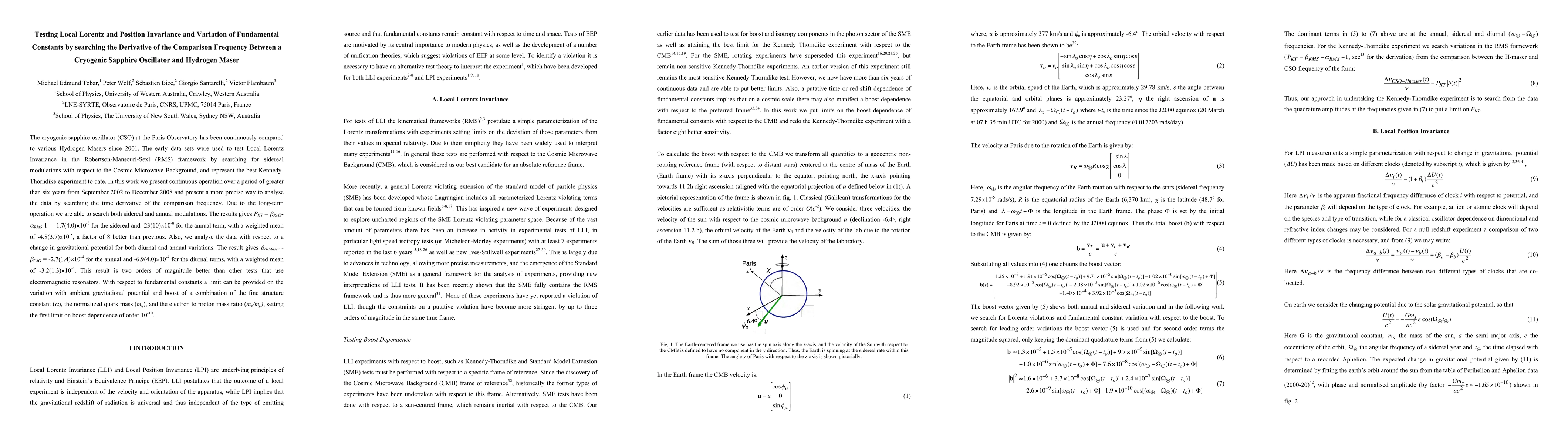 The cryogenic sapphire oscillator (CSO) at the Paris Observatory has been continuously compared to various Hydrogen Masers since 2001. The early data sets were used to test Local Lorentz Invariance in the Robertson-Mansouri-Sexl (RMS) framework by searching for sidereal modulations with respect to the Cosmic Microwave Background, and represent the best Kennedy-Thorndike experiment to date. In this work we present continuous operation over a period of greater than six years from September 2002 to December 2008 and present a more precise way to analyze the data by searching the time derivative of the comparison frequency. Due to the long-term operation we are able to search both sidereal and annual modulations. The results gives P_{KT} = \beta_{RMS}-\alpha_{RMS}-1 = -1.7(4.0) \times 10^{-8} for the sidereal and -23(10) \times 10^{-8} for the annual term, with a weighted mean of -4.8(3.7) \times 10^{-8}, a factor of 8 better than previous. Also, we analyze the data with respect to a change in gravitational potential for both diurnal and annual variations. The result gives \beta_{H-Maser} - \beta_{CSO} = -2.7(1.4) \times 10^{-4} for the annual and -6.9(4.0) \times 10^{-4} for the diurnal terms, with a weighted mean of -3.2(1.3) \times 10^{-4}. This result is two orders of magnitude better than other tests that use electromagnetic resonators. With respect to fundamental constants a limit can be provided on the variation with ambient gravitational potential and boost of a combination of the fine structure constant (\alpha), the normalized quark mass (m_q), and the electron to proton mass ratio (m_e/m_p), setting the first limit on boost dependence of order 10^{-10}.
