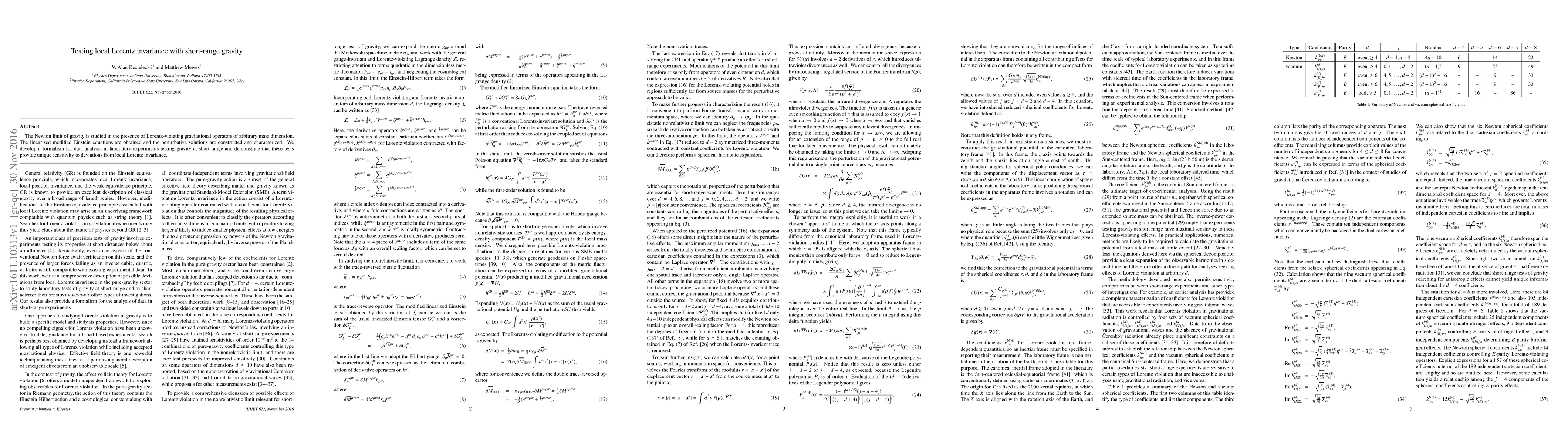 The paper presents a formalism for analyzing short-range gravity tests that incorporates Lorentz violation of arbitrary mass dimension, enabling the characterization of sideral variations in experimental data and the separation of observable signals into those from gravitational radiation and those unique to short-range tests.