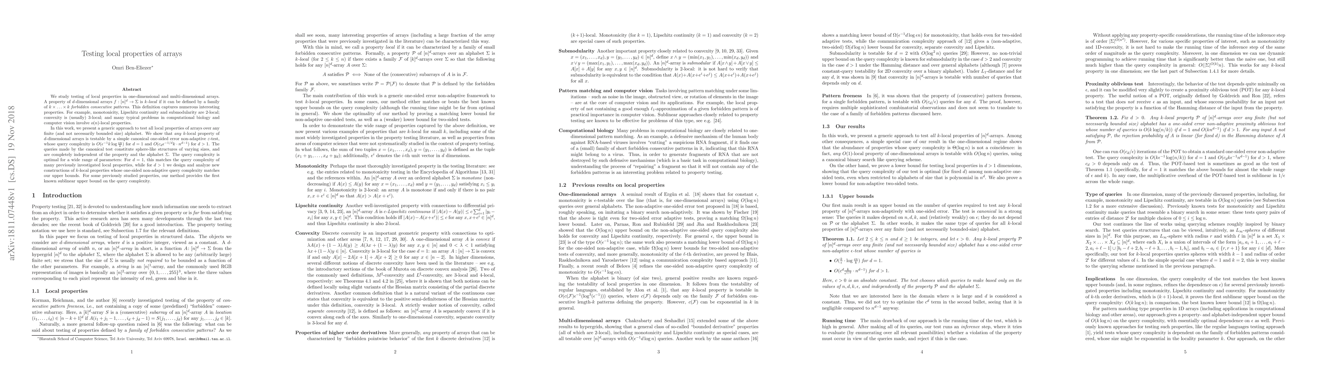 The paper introduces a generic, non-adaptive, one-sided error test for all k-local properties of d-dimensional arrays with optimal query complexity, which is independent of the property and alphabet.