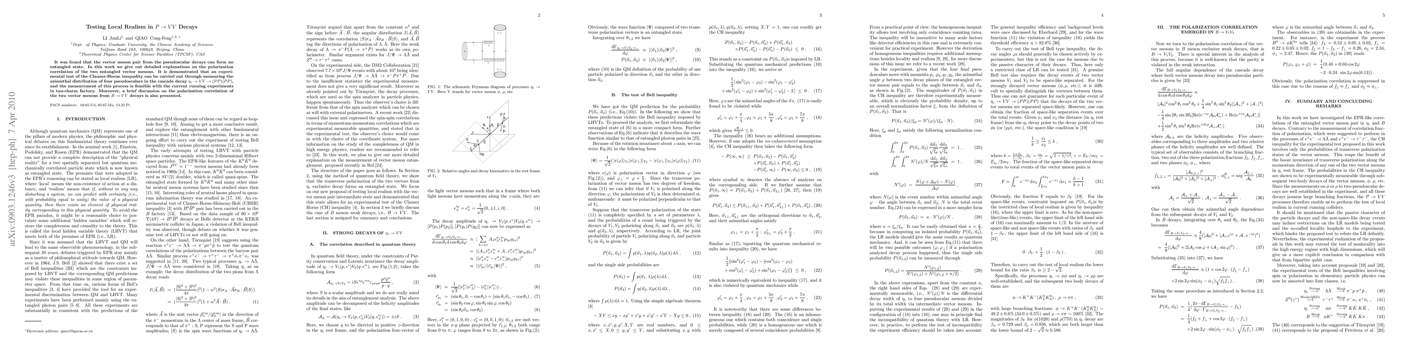 It was found that the vector meson pair from the pseudoscalar decays can form an entangled state. In this work we give out detailed explanations on the polarization correlation of the two entangled vector mesons. It is demonstrated that an experimental test of the Clauser-Horne inequality can be carried out through measuring the azimuthal distribution of four pseudoscalars in the cascade decay $\eta_c \to VV \to (PP)(PP)$, and the measurement of this process is feasible with the current running experiments in tau-charm factory. Moreover, a brief discussion on the polarization correlation of the two vector mesons from $B \to VV$ decays is also presented.