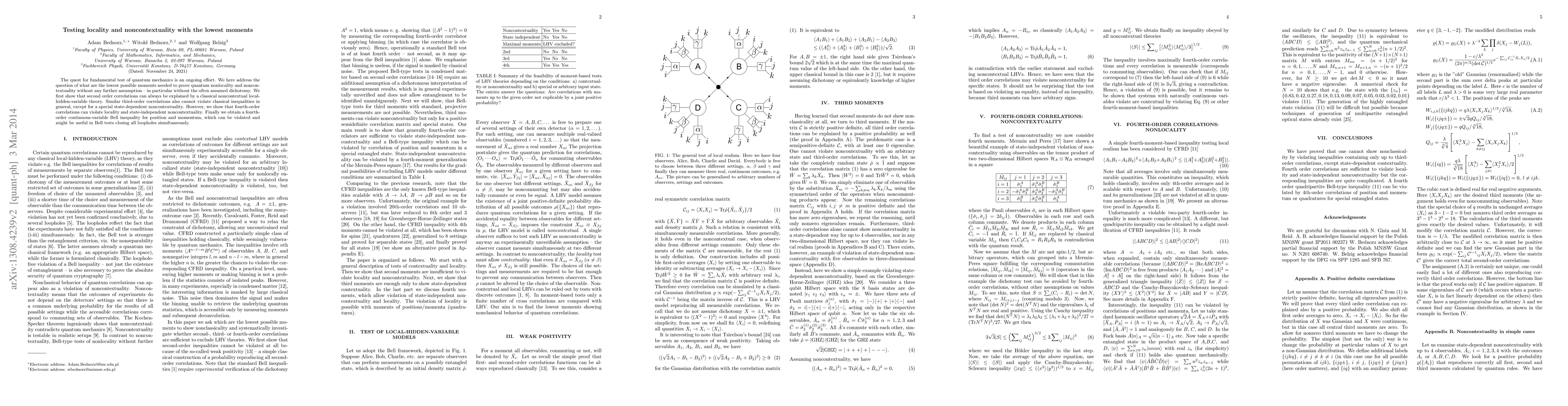 The quest for fundamental test of quantum mechanics is an ongoing effort. We here address the question of what are the lowest possible moments needed to prove quantum nonlocality and noncontextuality without any further assumption -- in particular without the often assumed dichotomy. We first show that second order correlations can always be explained by a classical noncontextual local-hidden-variable theory. Similar third-order correlations also cannot violate classical inequalities in general, except for a special state-dependent noncontextuality. However, we show that fourth-order correlations can violate locality and state-independent noncontextuality. Finally we obtain a fourth-order continuous-variable Bell inequality for position and momentum, which can be violated and might be useful in Bell tests closing all loopholes simultaneously.