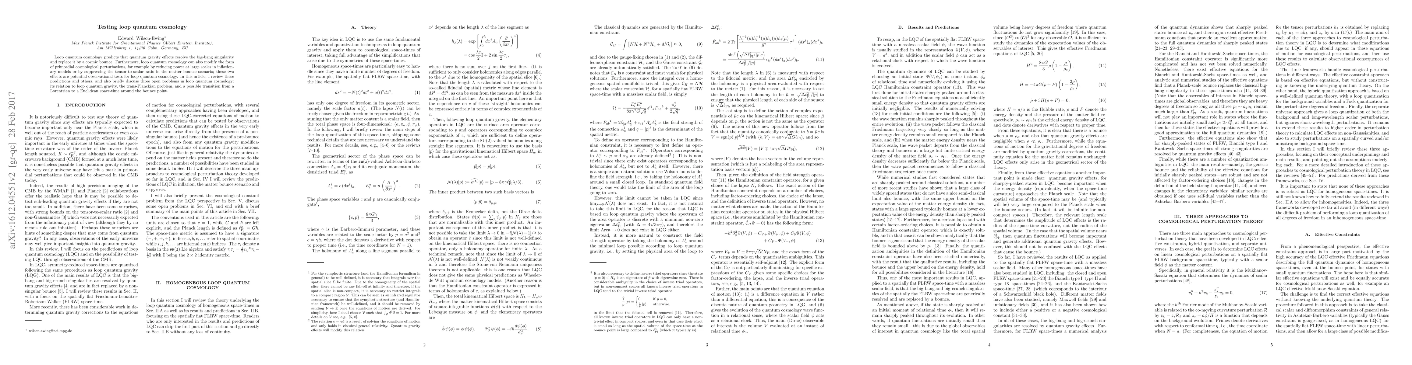 The paper reviews loop quantum cosmology (LQC) predictions, focusing on its resolution of the big-bang singularity through a cosmic bounce and its potential modifications to primordial cosmological perturbations.