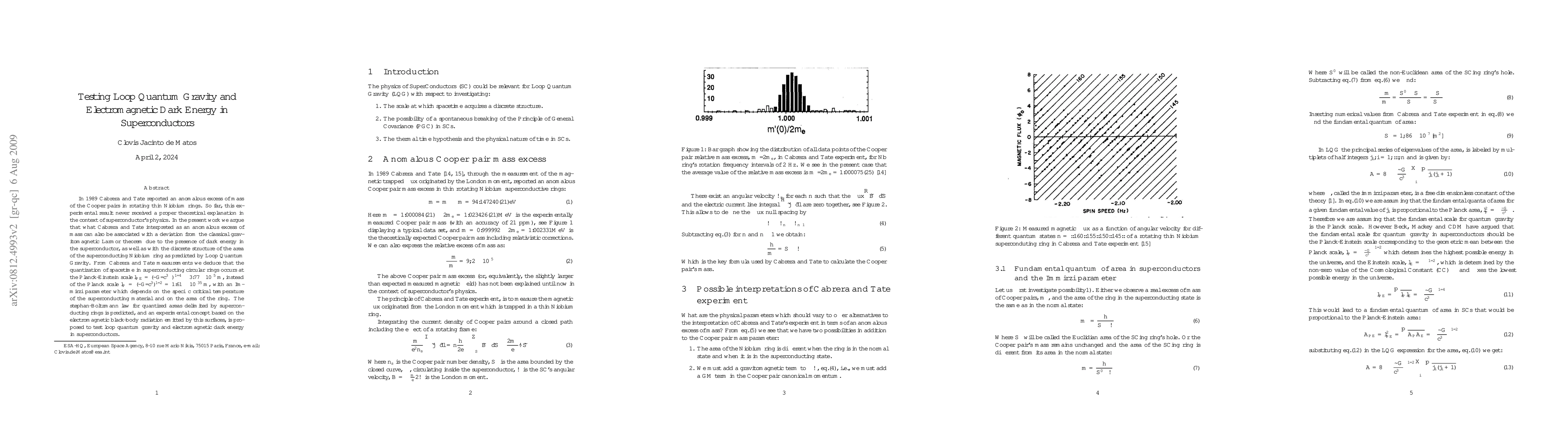 In 1989 Cabrera and Tate reported an anomalous excess of mass of the Cooper pairs in rotating thin Niobium rings. So far, this experimental result never received a proper theoretical explanation in the context of superconductor's physics. In the present work we argue that what Cabrera and Tate interpreted as an anomalous excess of mass can also be associated with a deviation from the classical gravitomagnetic Larmor theorem due to the presence of dark energy in the superconductor, as well as with the discrete structure of the area of the superconducting Niobium ring as predicted by Loop Quantum Gravity. From Cabrera and Tate measurements we deduce that the quantization of spacetime in superconducting circular rings occurs at the Planck-Einstein scale $l_{PE} = (\hbar G/c^3 \Lambda)^{1/4}\sim 3.77\times 10 ^{-5} m$, instead of the Planck scale $l_{P} =(\hbar G / c^3)^{1/2}=1.61 \times 10 ^{-35} m$, with an Immirzi parameter which depends on the specific critical temperature of the superconducting material and on the area of the ring. The stephan-Boltzmann law for quantized areas delimited by superconducting rings is predicted, and an experimental concept based on the electromagnetic black-body radiation emitted by this surfaces, is proposed to test loop quantum gravity and electromagnetic dark energy in superconductors.