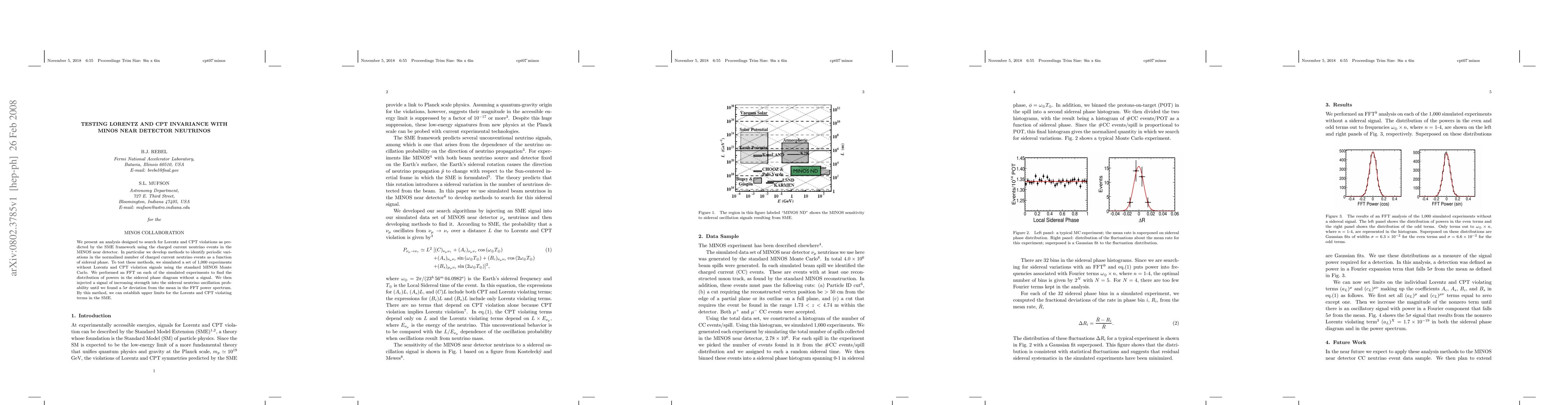 This paper investigates potential Lorentz and CPT violations using charged current neutrino events from the MINOS near detector, employing sidereal phase analysis and FFT techniques. The study establishes upper limits for SME terms by simulating experiments and identifying the threshold for a 5$\sigma$ deviation in the FFT power spectrum.