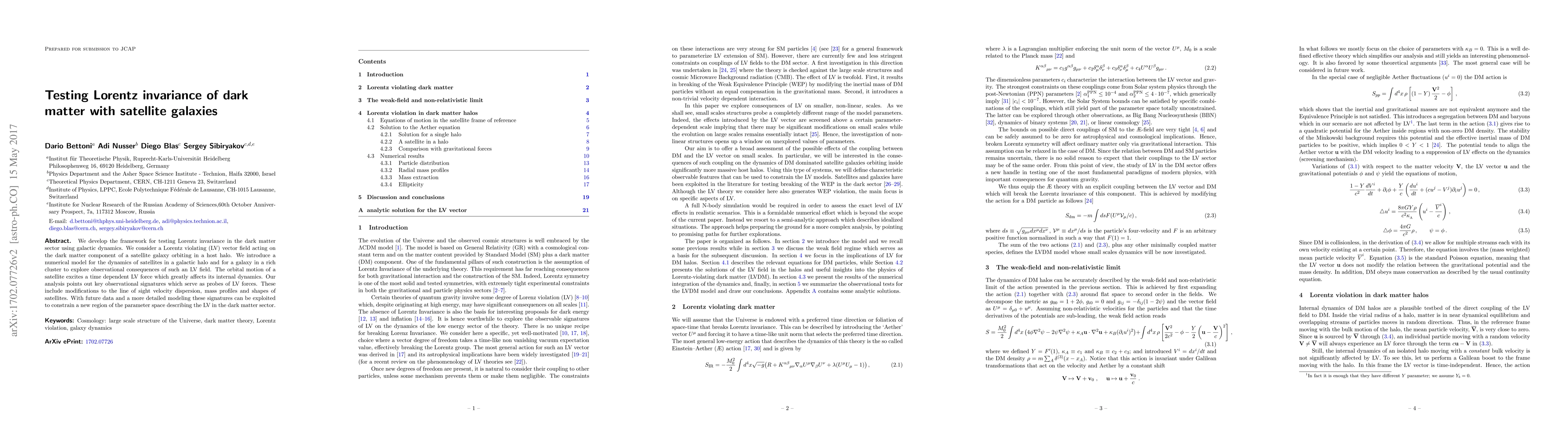 This paper develops a framework to test Lorentz invariance in dark matter using satellite galaxy dynamics, introducing a Lorentz violating vector field affecting dark matter. It predicts observational signatures like changes in velocity dispersion and mass profiles, aiming to constrain parameters of Lorentz violation with future data.