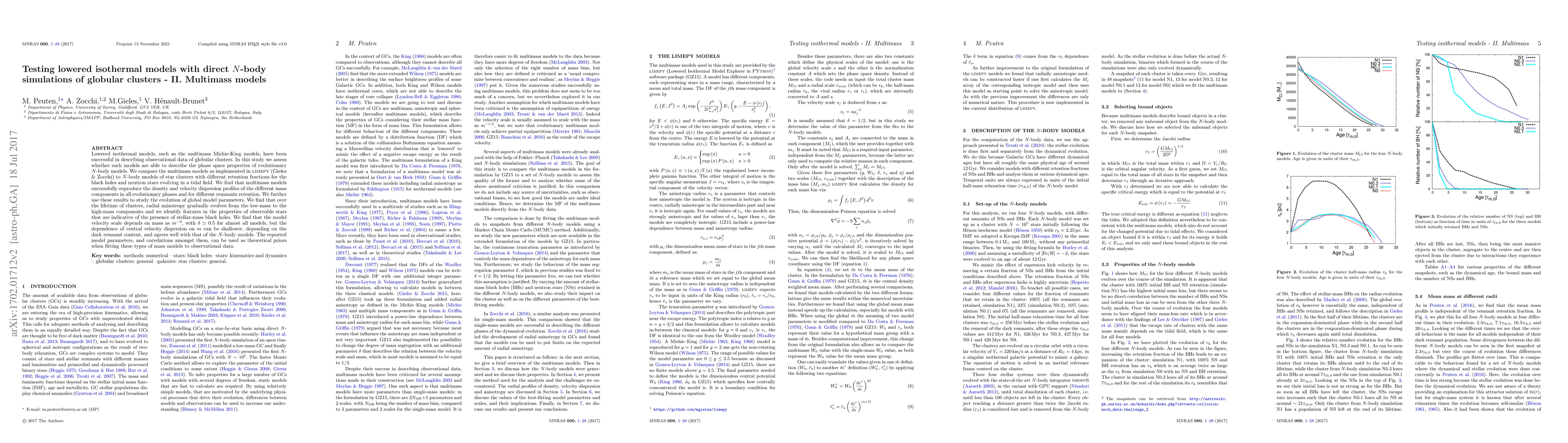 Lowered isothermal models, such as the multimass Michie-King models, have been successful in describing observational data of globular clusters. In this study we assess whether such models are able to describe the phase space properties of evolutionary $N$-body models. We compare the multimass models as implemented in (Gieles \& Zocchi) to $N$-body models of star clusters with different retention fractions for the black holes and neutron stars evolving in a tidal field. We find that multimass models successfully reproduce the density and velocity dispersion profiles of the different mass components in all evolutionary phases and for different remnants retention. We further use these results to study the evolution of global model parameters. We find that over the lifetime of clusters, radial anisotropy gradually evolves from the low-mass to the high-mass components and we identify features in the properties of observable stars that are indicative of the presence of stellar-mass black holes. We find that the model velocity scale depends on mass as $m^{-\delta}$, with $\delta\simeq0.5$ for almost all models, but the dependence of central velocity dispersion on $m$ can be shallower, depending on the dark remnant content, and agrees well with that of the $N$-body models. The reported model parameters, and correlations amongst them, can be used as theoretical priors when fitting these types of mass models to observational data.