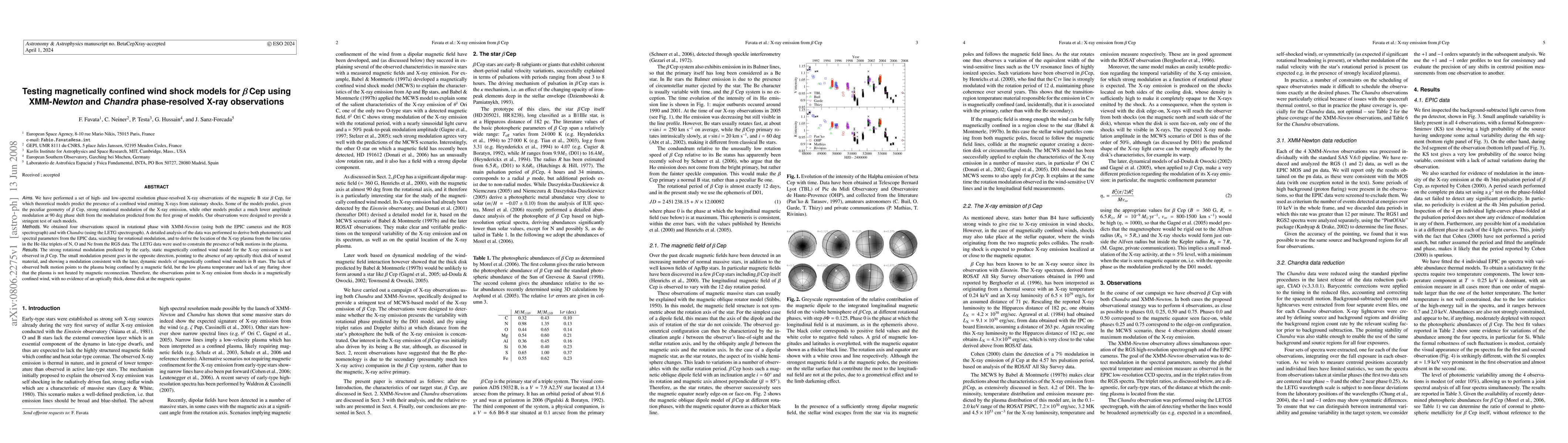 This paper investigates XMM-Newton and Chandra phase-resolved X-ray observations of the magnetic B star Beta Cep, finding no strong rotational modulation in the X-ray emission, which contradicts early static wind models. Instead, the results support dynamic magnetically confined wind models, indicating X-ray emission from shocks without evidence of an optically thick disk.