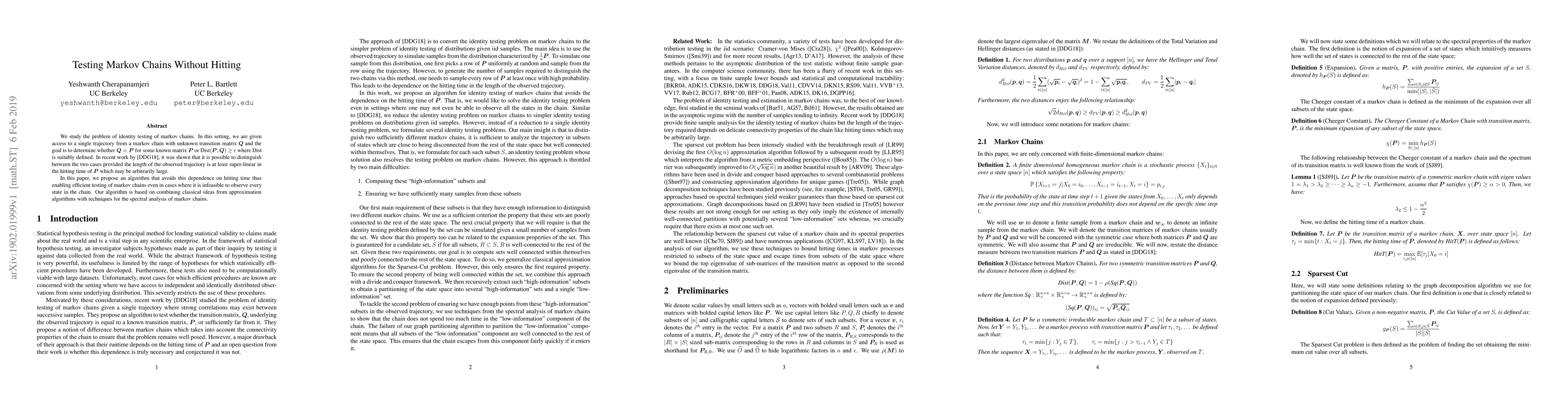 We study the problem of identity testing of markov chains. In this setting, we are given access to a single trajectory from a markov chain with unknown transition matrix $Q$ and the goal is to determine whether $Q = P$ for some known matrix $P$ or $\text{Dist}(P, Q) \geq \epsilon$ where $\text{Dist}$ is suitably defined. In recent work by Daskalakis, Dikkala and Gravin, 2018, it was shown that it is possible to distinguish between the two cases provided the length of the observed trajectory is at least super-linear in the hitting time of $P$ which may be arbitrarily large. In this paper, we propose an algorithm that avoids this dependence on hitting time thus enabling efficient testing of markov chains even in cases where it is infeasible to observe every state in the chain. Our algorithm is based on combining classical ideas from approximation algorithms with techniques for the spectral analysis of markov chains.