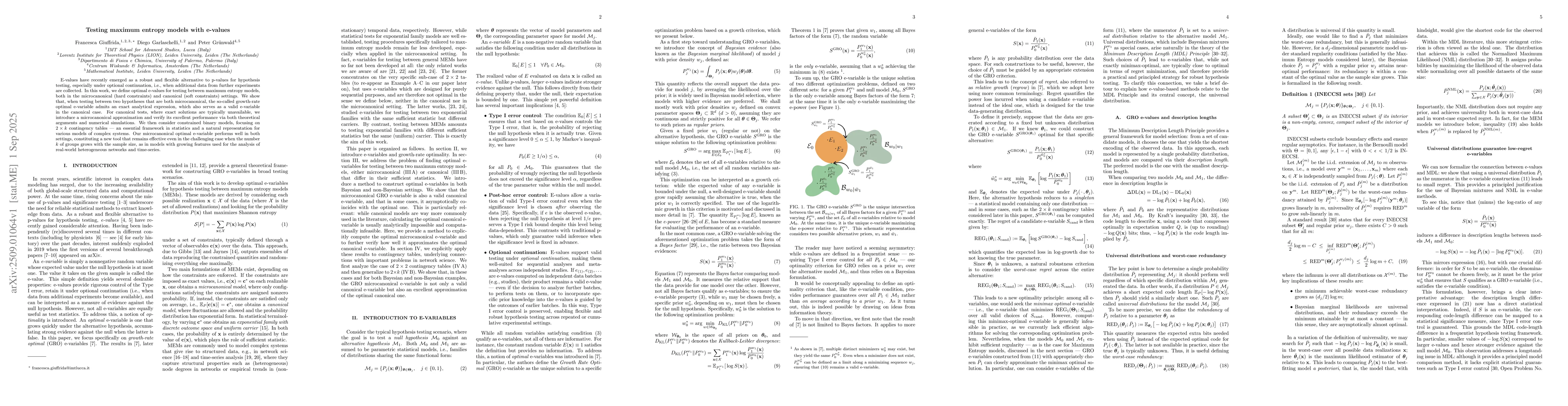 E-values have recently emerged as a robust and flexible alternative to p-values for hypothesis testing, especially under optional continuation, i.e., when additional data from further experiments are collected. In this work, we define optimal e-values for testing between maximum entropy models, both in the microcanonical (hard constraints) and canonical (soft constraints) settings. We show that, when testing between two hypotheses that are both microcanonical, the so-called growth-rate optimal e-variable admits an exact analytical expression, which also serves as a valid e-variable in the canonical case. For canonical tests, where exact solutions are typically unavailable, we introduce a microcanonical approximation and verify its excellent performance via both theoretical arguments and numerical simulations. We then consider constrained binary models, focusing on $2 \times k$ contingency tables -- an essential framework in statistics and a natural representation for various models of complex systems. Our microcanonical optimal e-variable performs well in both settings, constituting a new tool that remains effective even in the challenging case when the number $k$ of groups grows with the sample size, as in models with growing features used for the analysis of real-world heterogeneous networks and time-series.