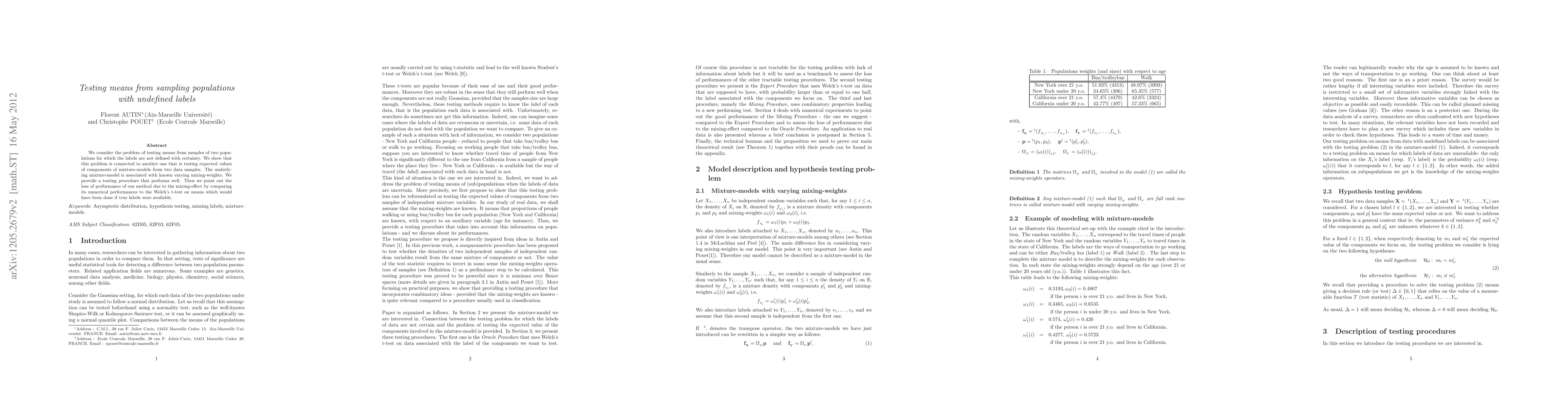 Researchers developed a testing method for means from samples of two populations with undefined labels, comparing it to the Welch's t-test on means for performance, highlighting the impact of 'mixing-effect'.