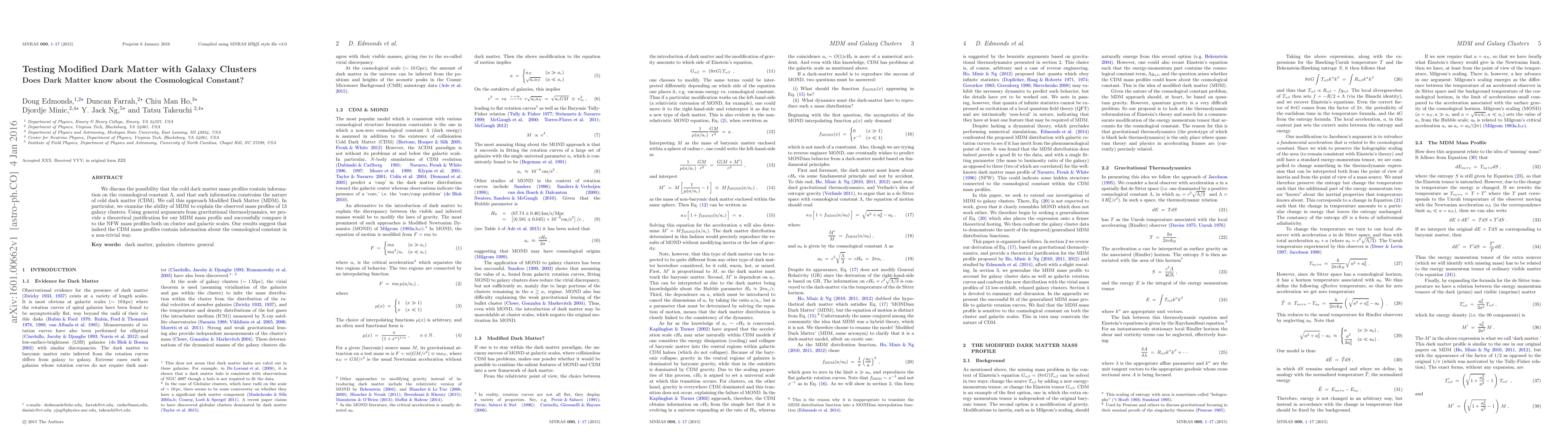 We discuss the possibility that the cold dark matter mass profiles contain information on the cosmological constant, and that such information constrains the nature of cold dark matter (CDM). We call this approach Modified Dark Matter (MDM). In particular, we examine the ability of MDM to explain the observed mass profiles of 13 galaxy clusters. Using general arguments from gravitational thermodynamics, we provide a theoretical justification for our MDM mass profile and successfully compare it to the NFW mass profiles both on cluster and galactic scales. Our results suggest that indeed the CDM mass profiles contain information about the cosmological constant in a non-trivial way.