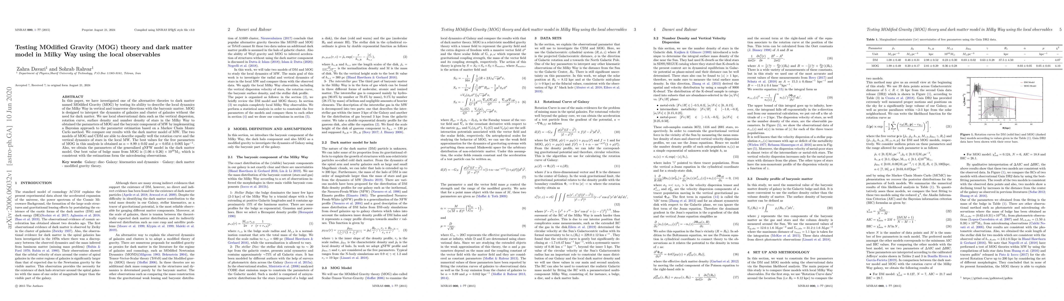 This paper tests the MOdified Gravity (MOG) theory as an alternative to dark matter by analyzing local Milky Way dynamics using observational data. The results show that MOG and the dark matter model describe the Milky Way's rotation curve and vertical star dynamics equally well, with best parameter values for MOG obtained.