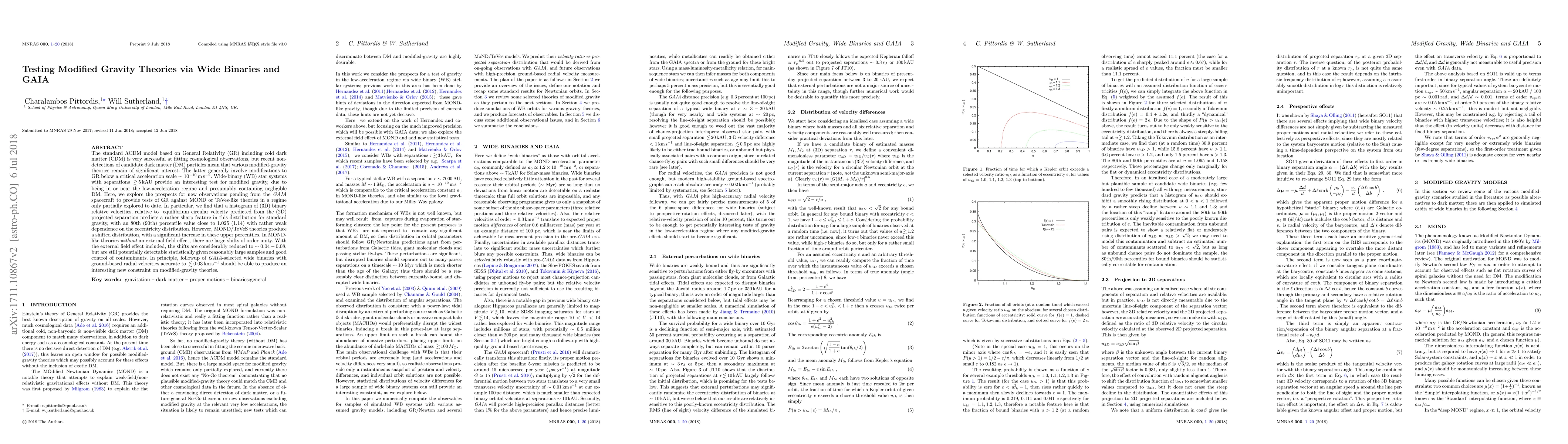 The standard LambdaCDM model based on General Relativity (GR) including cold dark matter (CDM) is very successful at fitting cosmological observations, but recent non-detections of candidate dark matter (DM) particles mean that various modified-gravity theories remain of significant interest. The latter generally involve modifications to GR below a critical acceleration scale $\sim 10^{-10} \, m \, s^{-2}$. Wide-binary (WB) star systems with separations $> 5 \, kAU$ provide an interesting test for modified gravity, due to being in or near the low-acceleration regime and presumably containing negligible DM. Here, we explore the prospects for new observations pending from the GAIA spacecraft to provide tests of GR against MOND or TeVes-like theories in a regime only partially explored to date. In particular, we find that a histogram of (3D) binary relative velocities against circular velocity predicted from the (2D) projected separations predicts a rather sharp feature in this distribution for standard gravity, with an 80th (90th) percentile value close to 1.025 (1.14) with rather weak dependence on the eccentricity distribution. However, MOND/TeVeS theories produce a shifted distribution, with a significant increase in these upper percentiles. In MOND-like theories {\em without} an external field effect, there are large shifts of order unity. With the external field effect included, the shifts are considerably reduced to $\sim 0.04 - 0.08$, but are still potentially detectable statistically given reasonably large samples and good control of contaminants. In principle, followup of GAIA-selected wide binaries with ground-based radial velocities accurate to < 0.03 km/s should be able to produce an interesting new constraint on modified-gravity theories.