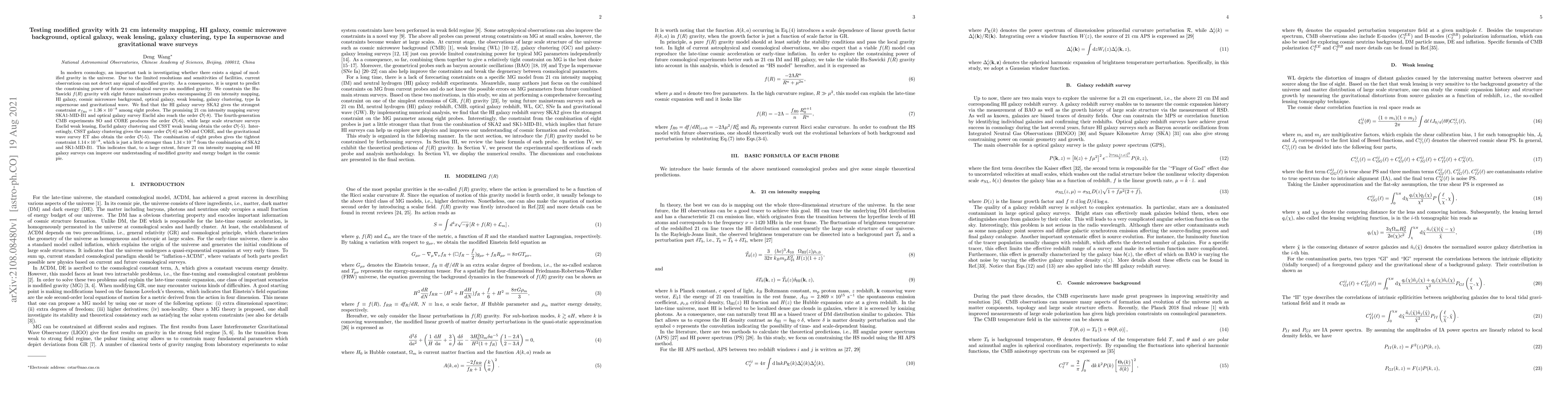 This paper investigates the potential of future cosmological surveys to detect signals of modified gravity, finding that the SKA2 HI galaxy survey provides the strongest constraint. The combination of eight probes, including 21 cm intensity mapping, CMB, optical galaxy, weak lensing, galaxy clustering, supernovae, and gravitational wave surveys, yields the tightest constraint, indicating significant improvements in understanding modified gravity from upcoming surveys.