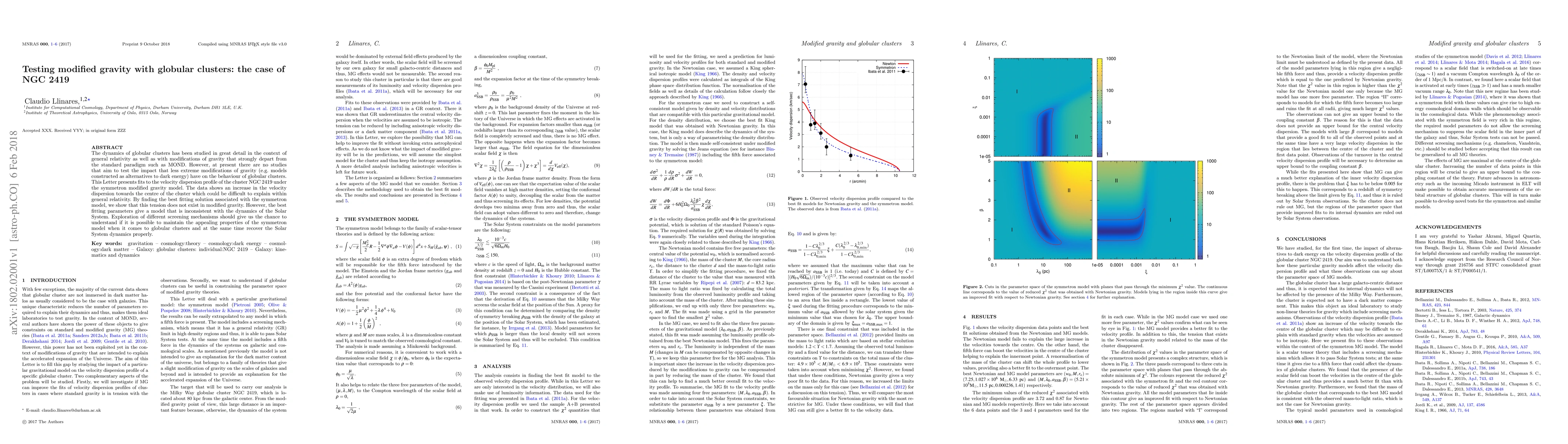 The dynamics of globular clusters has been studied in great detail in the context of general relativity as well as with modifications of gravity that strongly depart from the standard paradigm such as MOND. However, at present there are no studies that aim to test the impact that less extreme modifications of gravity (e.g. models constructed as alternatives to dark energy) have on the behaviour of globular clusters. This Letter presents fits to the velocity dispersion profile of the cluster NGC 2419 under the symmetron modified gravity model. The data shows an increase in the velocity dispersion towards the centre of the cluster which could be difficult to explain within general relativity. By finding the best fitting solution associated with the symmetron model, we show that this tension does not exist in modified gravity. However, the best fitting parameters give a model that is inconsistent with the dynamics of the Solar System. Exploration of different screening mechanisms should give us the chance to understand if it is possible to maintain the appealing properties of the symmetron model when it comes to globular clusters and at the same time recover the Solar System dynamics properly.