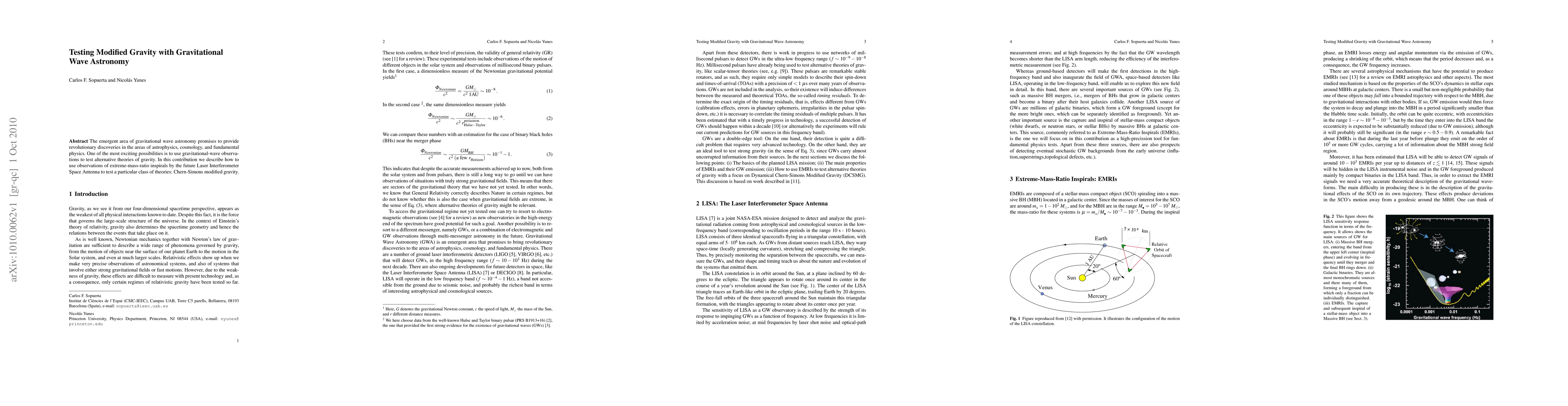 This paper explores the use of gravitational wave observations from the Laser Interferometer Space Antenna to test Chern-Simons modified gravity, offering a novel approach to examining alternative theories of gravity through extreme-mass-ratio inspirals.
