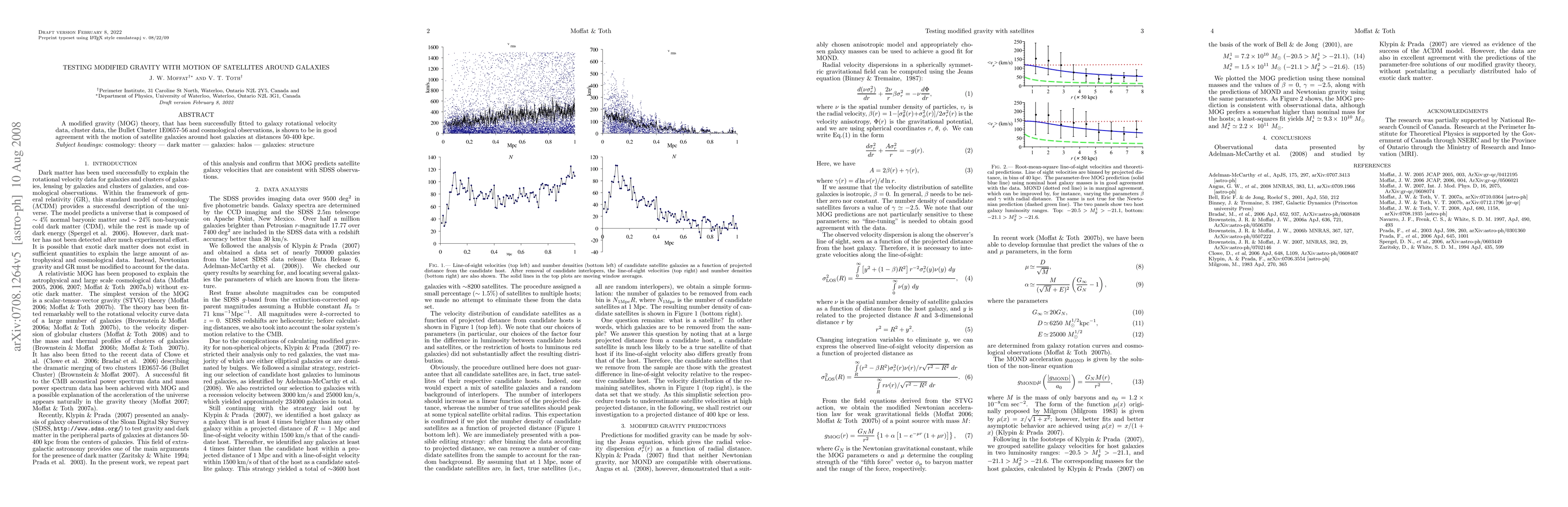 A modified gravity (MOG) theory, that has been successfully fitted to galaxy rotational velocity data, cluster data, the Bullet Cluster 1E0657-56 and cosmological observations, is shown to be in good agreement with the motion of satellite galaxies around host galaxies at distances 50-400 kpc.