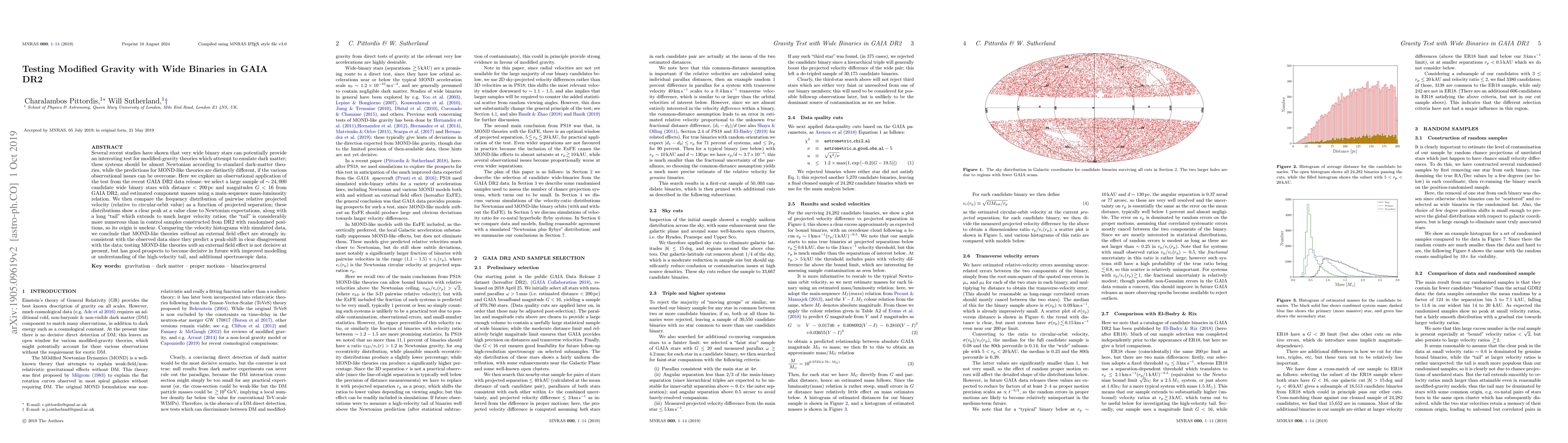 This paper tests modified gravity theories using wide binary stars from GAIA DR2 data, finding a peak in relative velocity distributions consistent with Newtonian predictions, but a long "tail" of high-velocity ratios that challenges MOND-like models without an external field effect. Future improvements may resolve the inconsistency.