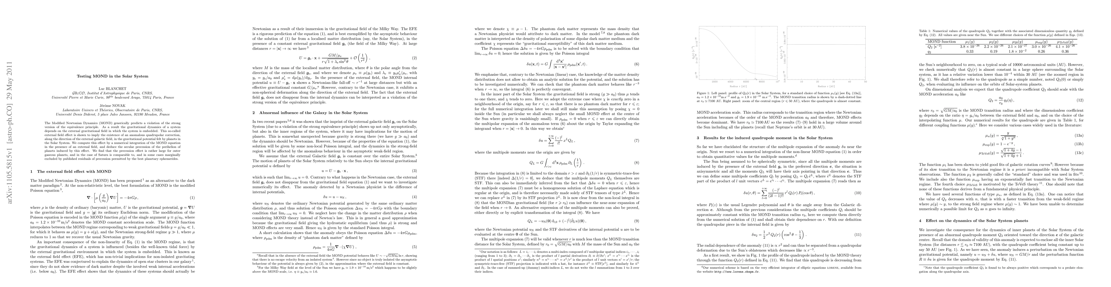 This paper investigates the Modified Newtonian Dynamics (MOND) and its implications for the strong equivalence principle, finding a significant quadrupolar correction in the gravitational potential affecting the Solar System's planets. The study concludes that MOND's external field effect could account for a notable precession of Saturn's perihelion, potentially explaining some discrepancies in planetary ephemerides.