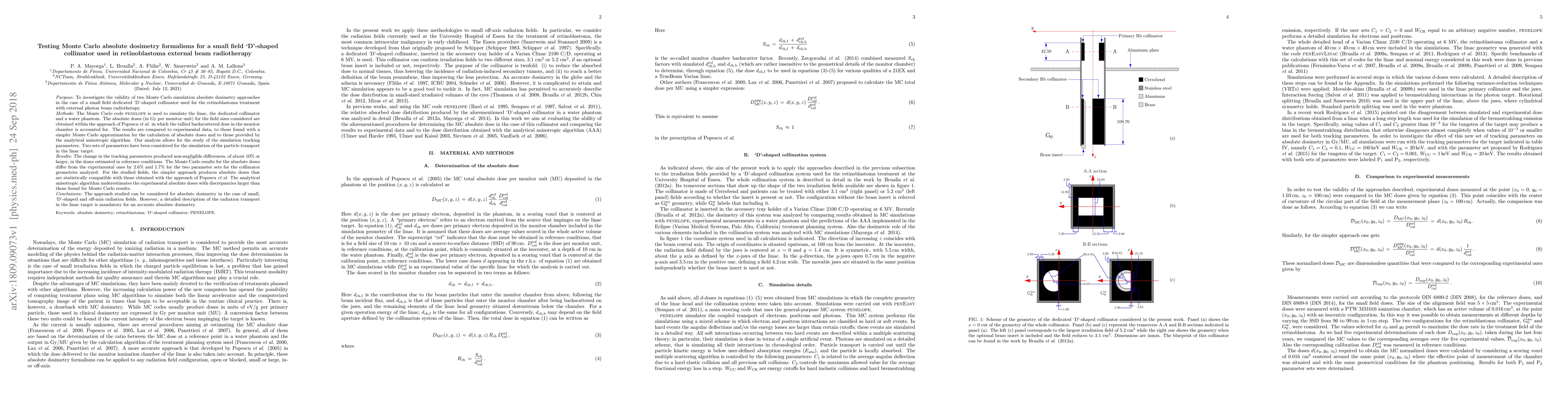 This study evaluates the accuracy of two Monte Carlo simulation methods for absolute dosimetry in small `D'-shaped collimator fields used in retinoblastoma radiotherapy. The results show that while the methods are valid, detailed simulation parameters are crucial for precise dose estimation, with discrepancies up to 10% depending on the parameters used.