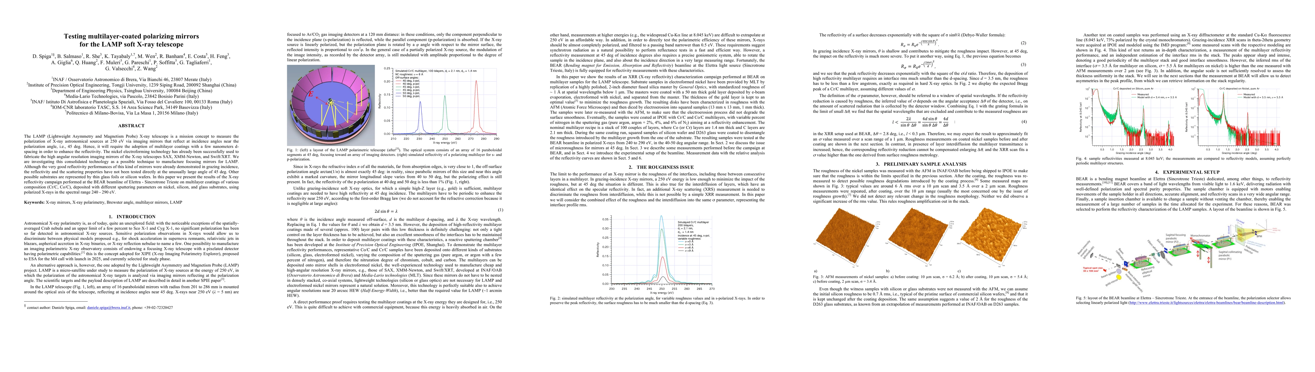 The LAMP (Lightweight Asymmetry and Magnetism Probe) X-ray telescope is a mission concept to measure the polarization of X-ray astronomical sources at 250 eV via imaging mirrors that reflect at incidence angles near the polarization angle, i.e., 45 deg. Hence, it will require the adoption of multilayer coatings with a few nanometers d-spacing in order to enhance the reflectivity. The nickel electroforming technology has already been successfully used to fabricate the high angular resolution imaging mirrors of the X-ray telescopes SAX, XMM-Newton, and Swift/XRT. We are investigating this consolidated technology as a possible technique to manufacture focusing mirrors for LAMP. Although the very good reflectivity performances of this kind of mirrors were already demonstrated in grazing incidence, the reflectivity and the scattering properties have not been tested directly at the unusually large angle of 45 deg. Other possible substrates are represented by thin glass foils or silicon wafers. In this paper we present the results of the X-ray reflectivity campaign performed at the BEAR beamline of Elettra - Sincrotrone Trieste on multilayer coatings of various composition (Cr/C, Co/C), deposited with different sputtering parameters on nickel, silicon, and glass substrates, using polarized X-rays in the spectral range 240 - 290 eV.
