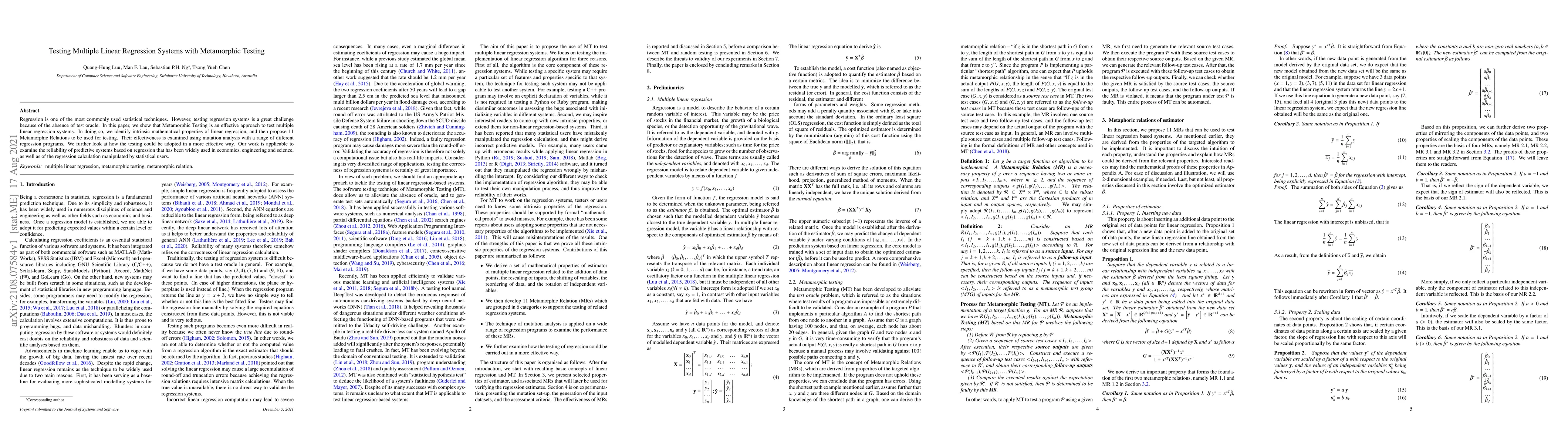 Regression is one of the most commonly used statistical techniques. However, testing regression systems is a great challenge because of the absence of test oracle in general. In this paper, we show that Metamorphic Testing is an effective approach to test multiple linear regression systems. In doing so, we identify intrinsic mathematical properties of linear regression, and then propose 11 Metamorphic Relations to be used for testing. Their effectiveness is examined using mutation analysis with a range of different regression programs. We further look at how the testing could be adopted in a more effective way. Our work is applicable to examine the reliability of predictive systems based on regression that has been widely used in economics, engineering and science, as well as of the regression calculation manipulated by statistical users.