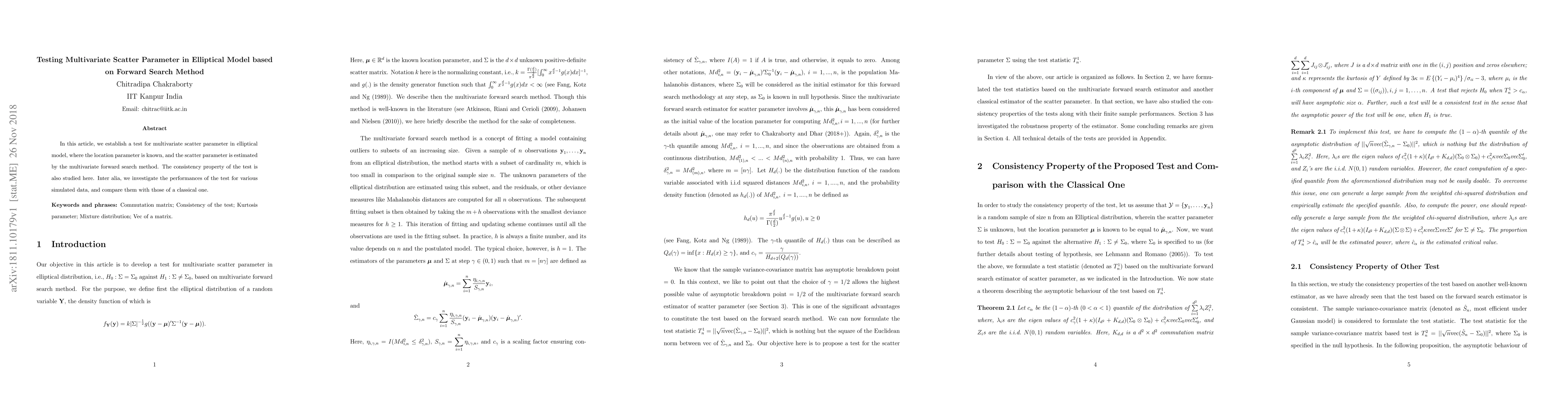 In this article, we establish a test for multivariate scatter parameter in elliptical model, where the location parameter is known, and the scatter parameter is estimated by the multivariate forward search method. The consistency property of the test is also studied here. Inter alia, we investigate the performances of the test for various simulated data, and compare them with those of a classical one.