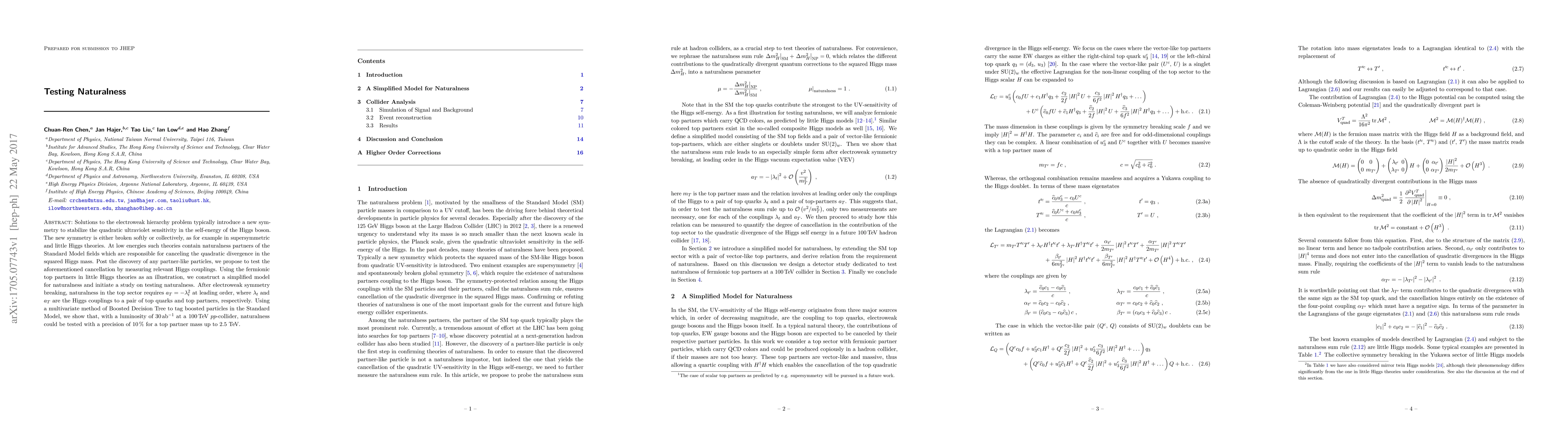 Solutions to the electroweak hierarchy problem typically introduce a new symmetry to stabilize the quadratic ultraviolet sensitivity in the self-energy of the Higgs boson. The new symmetry is either broken softly or collectively, as for example in supersymmetric and little Higgs theories. At low energies such theories contain naturalness partners of the Standard Model fields which are responsible for canceling the quadratic divergence in the squared Higgs mass. Post the discovery of any partner-like particles, we propose to test the aforementioned cancellation by measuring relevant Higgs couplings. Using the fermionic top partners in little Higgs theories as an illustration, we construct a simplified model for naturalness and initiate a study on testing naturalness. After electroweak symmetry breaking, naturalness in the top sector requires $a_T = - \lambda_t^2$ at leading order, where $\lambda_t$ and $a_T$ are the Higgs couplings to a pair of top quarks and top partners, respectively. Using a multivariate method of Boosted Decision Tree to tag boosted particles in the Standard Model, we show that, with a luminosity of 30 $ab^{-1}$ at a 100 TeV $pp$-collider, naturalness could be tested with a precision of 10 % for a top partner mass up to 2.5 TeV.