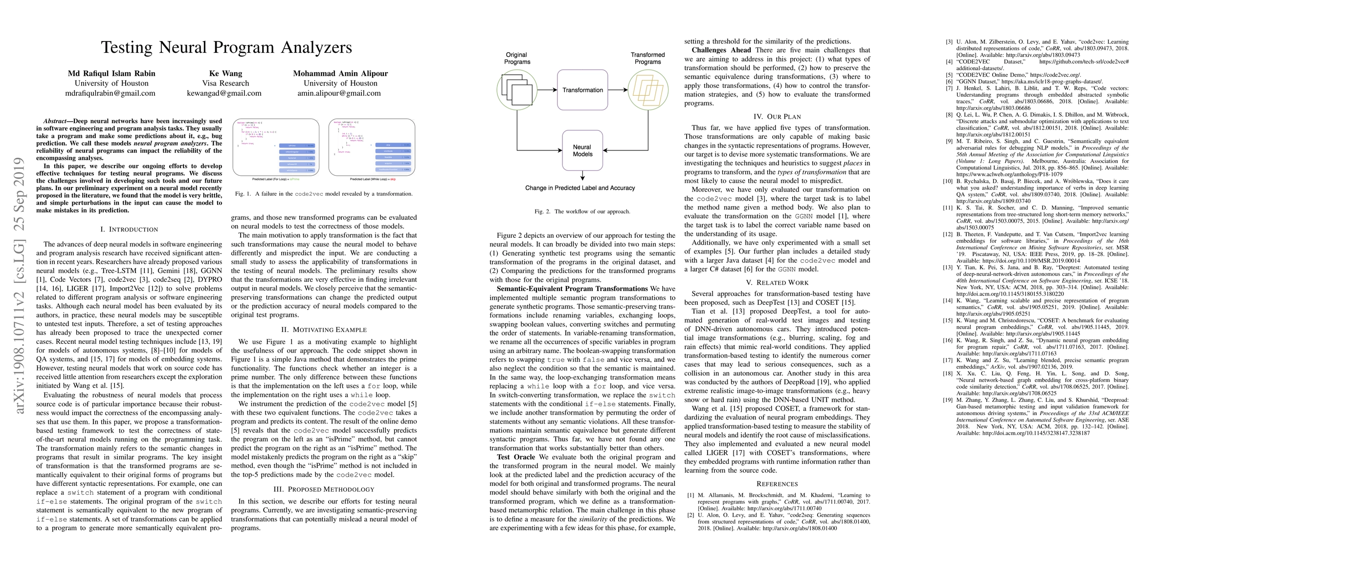 This paper explores techniques for testing neural program analyzers, which predict software issues like bugs. The authors highlight the challenges in developing such testing tools and report preliminary findings that show the brittleness of existing neural models, where minor input changes can lead to incorrect predictions.