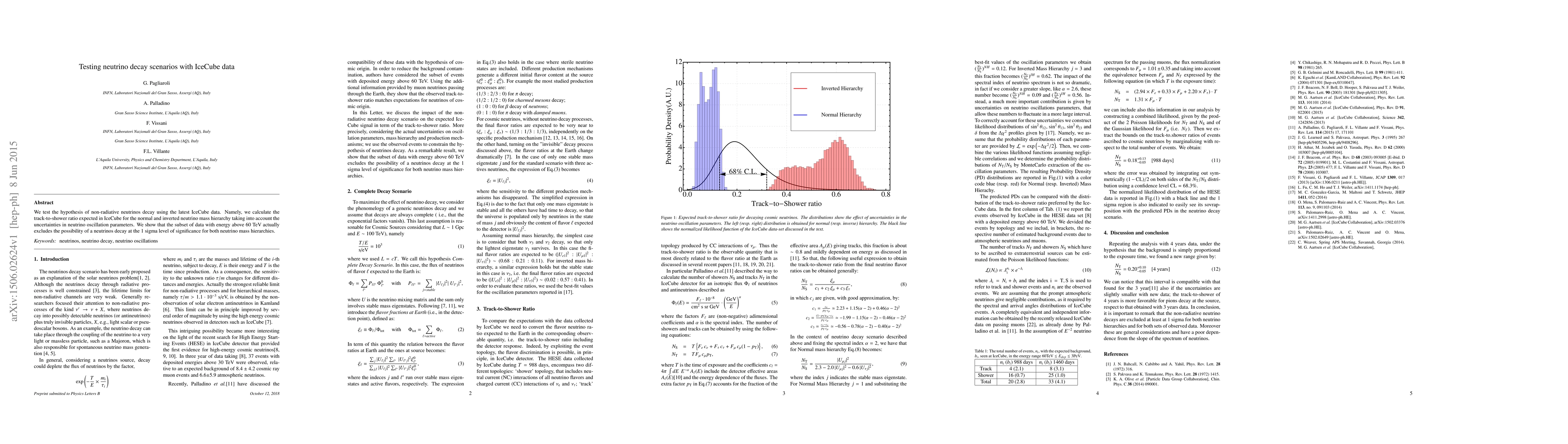 We test the hypothesis of non-radiative neutrinos decay using the latest IceCube data. Namely, we calculate the track-to-shower ratio expected in IceCube for the normal and inverted neutrino mass hierarchy taking into account the uncertainties in neutrino oscillation parameters. We show that the subset of data with energy above 60 TeV actually excludes the possibility of a neutrinos decay at the 1 sigma level of significance for both neutrino mass hierarchies.