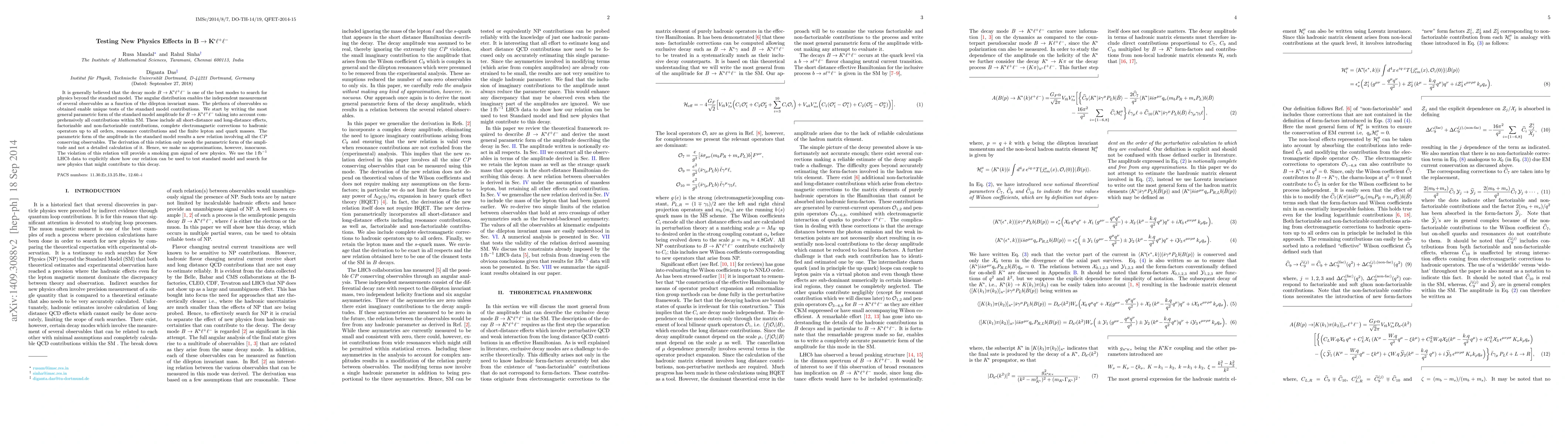 It is generally believed that the decay mode $B\to K^*\ell^+\ell^-$ is one of the best modes to search for physics beyond the standard model. The angular distribution enables the independent measurement of several observables as a function of the dilepton invariant mass. The plethora of observables so obtained enable unique tests of the standard model contributions. We start by writing the most general parametric form of the standard model amplitude for $B\to K^*\ell^+\ell^-$ taking into account comprehensively all contributions within SM. These include all short-distance and long-distance effects, factorizable and non-factorizable contributions, complete electromagnetic corrections to hadronic operators up to all orders, resonance contributions and the finite lepton and quark masses. The parametric form of the amplitude in the standard model results a new relation involving all the $CP$ conserving observables. The derivation of this relation only needs the parametric form of the amplitude and not a detailed calculation of it. Hence, we make no approximations, however, innocuous. The violation of this relation will provide a smoking gun signal of new physics. We use the $1 \text{fb}^{-1}$ LHC$b$ data to explicitly show how our relation can be used to test standard model and search for new physics that might contribute to this decay.