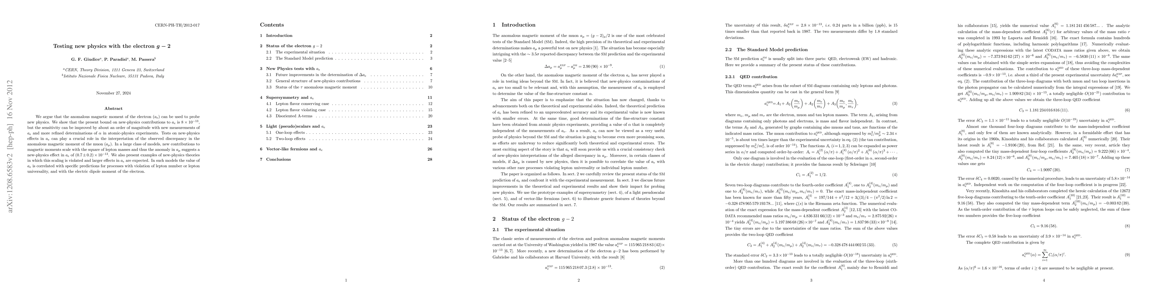 We argue that the anomalous magnetic moment of the electron (a_e) can be used to probe new physics. We show that the present bound on new-physics contributions to a_e is 8*10^-13, but the sensitivity can be improved by about an order of magnitude with new measurements of a_e and more refined determinations of alpha in atomic-physics experiments. Tests on new-physics effects in a_e can play a crucial role in the interpretation of the observed discrepancy in the anomalous magnetic moment of the muon (a_mu). In a large class of models, new contributions to magnetic moments scale with the square of lepton masses and thus the anomaly in a_mu suggests a new-physics effect in a_e of (0.7 +- 0.2)*10^-13. We also present examples of new-physics theories in which this scaling is violated and larger effects in a_e are expected. In such models the value of a_e is correlated with specific predictions for processes with violation of lepton number or lepton universality, and with the electric dipole moment of the electron.