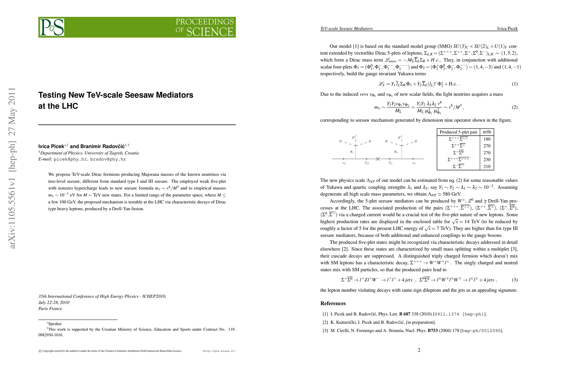We propose TeV-scale Dirac fermions producing Majorana masses of the known neutrinos via tree-level seesaw, different from standard type I and III seesaw. The employed weak five-plet with nonzero hypercharge leads to new seesaw formula m_\nu ~ v^6/M^5 and to empirical masses m_\nu ~ 10^{-1} eV for M ~ TeV new states. For a limited range of the parameter space, where M < a few 100 GeV, the proposed mechanism is testable at the LHC via characteristic decays of Dirac type heavy leptons, produced by a Drell-Yan fusion.