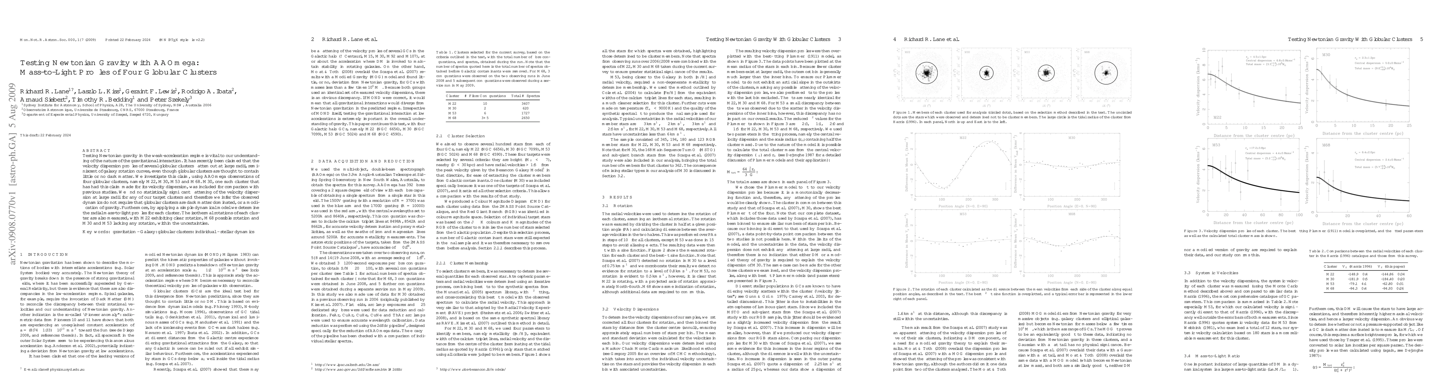 This study uses AAOmega observations to test Newtonian gravity in globular clusters M22, M30, M53, and M68, finding no evidence of velocity dispersion flattening at large radii, thus refuting claims of dark matter influence or gravitational modification. The research also determines radial mass-to-light profiles and measures isothermal rotations, revealing M22's clear rotation and possible rotation in M68, while M30 and M53 show no rotation.