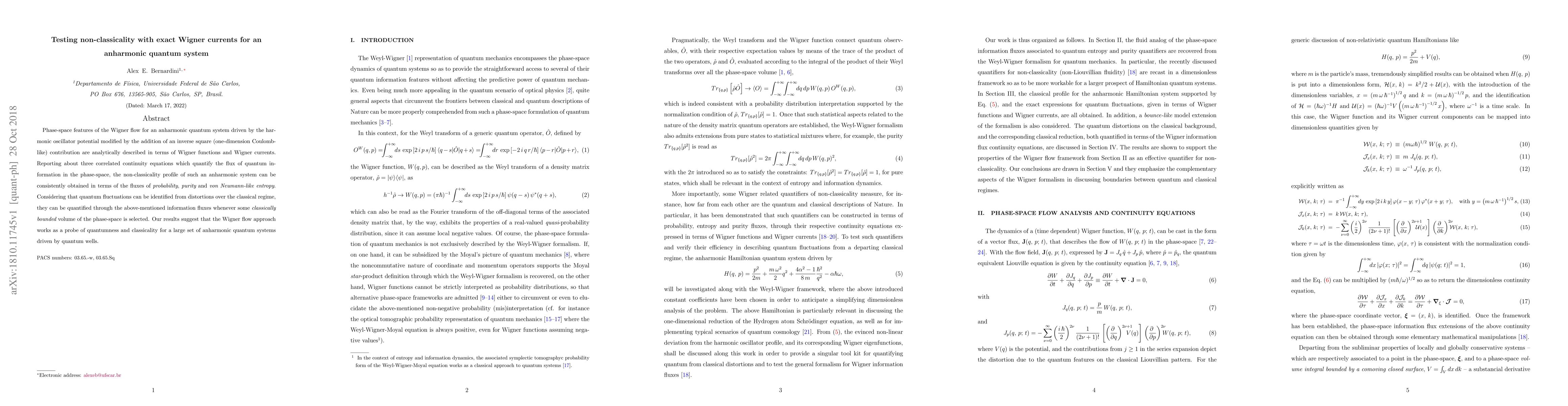 Phase-space features of the Wigner flow for an anharmonic quantum system driven by the harmonic oscillator potential modified by the addition of an inverse square (one-dimension Coulomb-like) contribution are analytically described in terms of Wigner functions and Wigner currents. Reporting about three correlated continuity equations which quantify the flux of quantum information in the phase-space, the non-classicality profile of such an anharmonic system can be consistently obtained in terms of the fluxes of {\em probability}, {\em purity} and {\em von Neumann-like entropy}. Considering that quantum fluctuations can be identified from distortions over the classical regime, they can be quantified through the above-mentioned information fluxes whenever some {\em classically bounded} volume of the phase-space is selected. Our results suggest that the Wigner flow approach works as a probe of quantumness and classicality for a large set of anharmonic quantum systems driven by quantum wells.