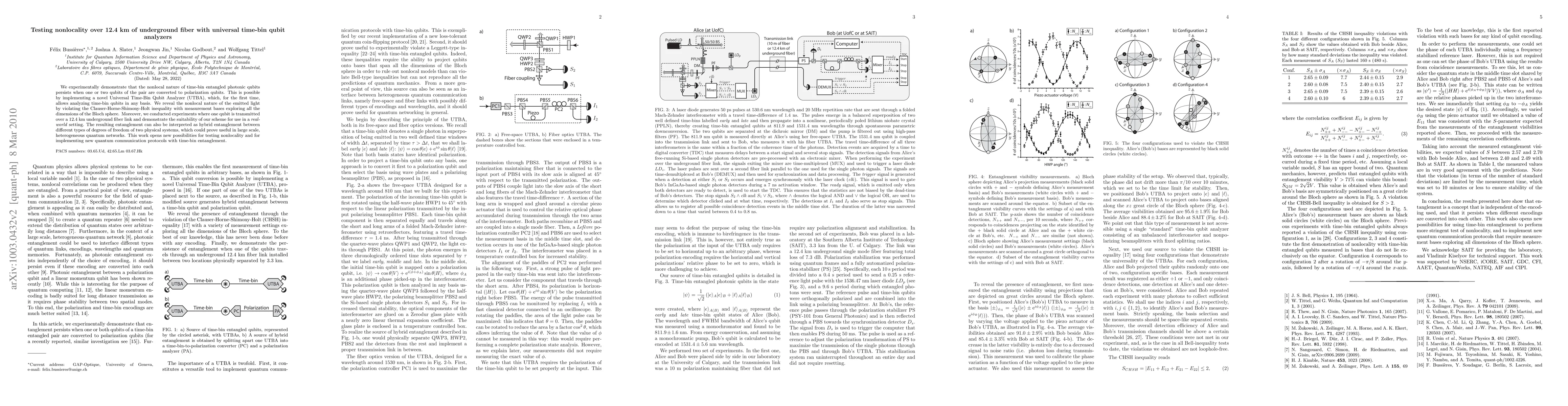 This paper demonstrates the persistence of nonlocality in time-bin entangled photonic qubits over a 12.4 km underground fiber link using a novel Universal Time-Bin Qubit Analyzer. The study shows that entanglement remains valid even when qubits are converted to polarization, and it violates the Clauser-Horne-Shimony-Holt inequality, indicating potential for quantum communication protocols.