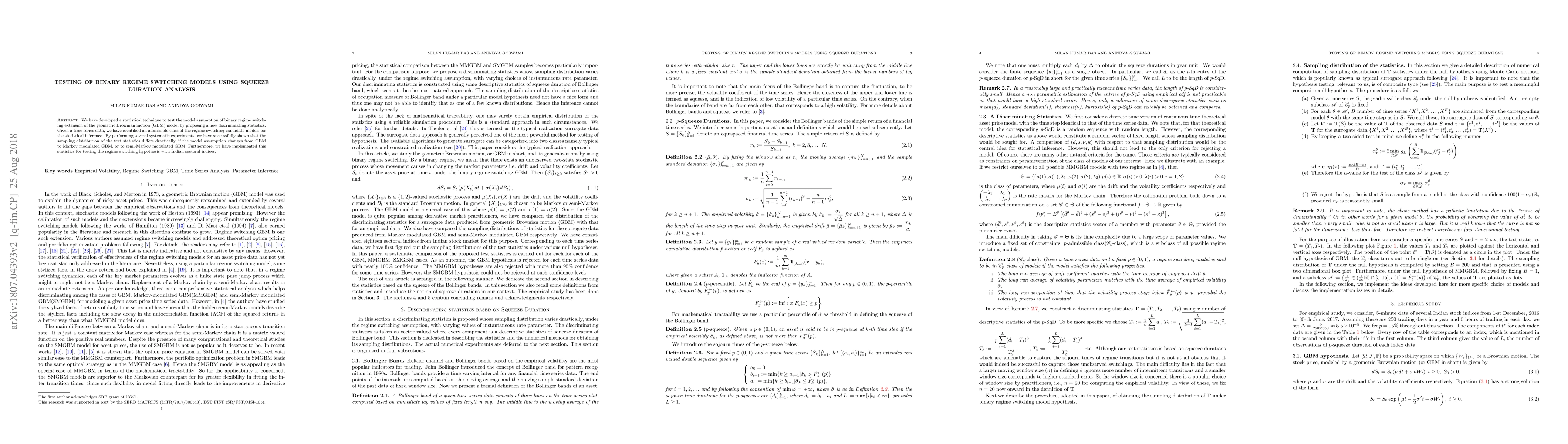 This research develops a new statistical technique to test binary regime switching in extended geometric Brownian motion models, proposing a discriminating statistic to distinguish between different switching models. The technique is validated through experiments showing distinct sampling distributions and is applied to test regime switching in Indian sectoral indices.