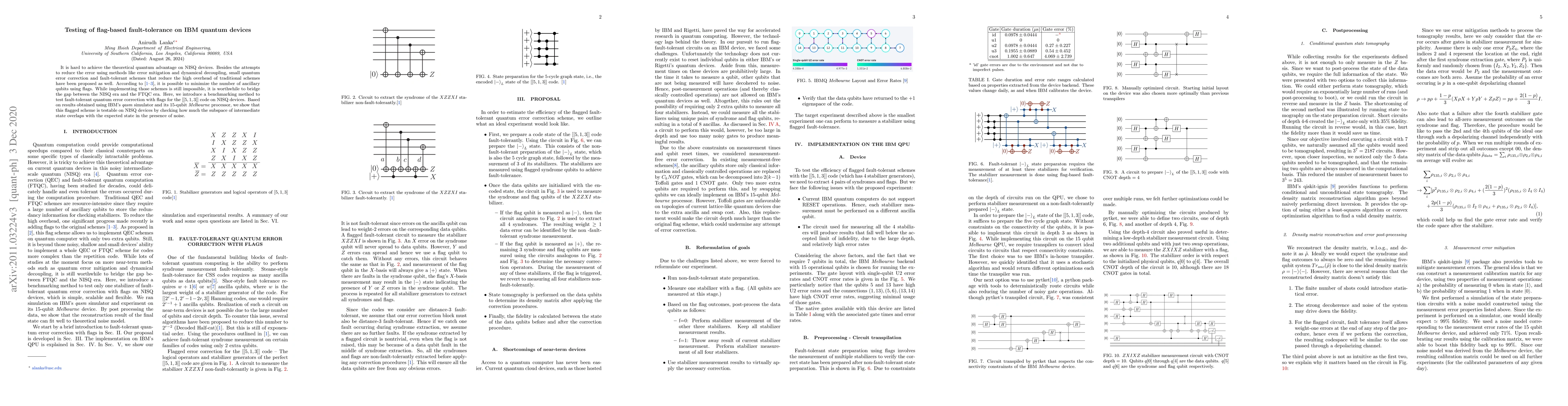 This paper proposes a benchmarking method for testing flag-based fault-tolerance on IBM quantum devices, specifically the [[5,1,3]] code. Results from IBM's qasm simulator and Melbourne processor demonstrate that flagged schemes can be evaluated on NISQ devices by measuring the overlap of intermediate state subspaces with expected states under noise.