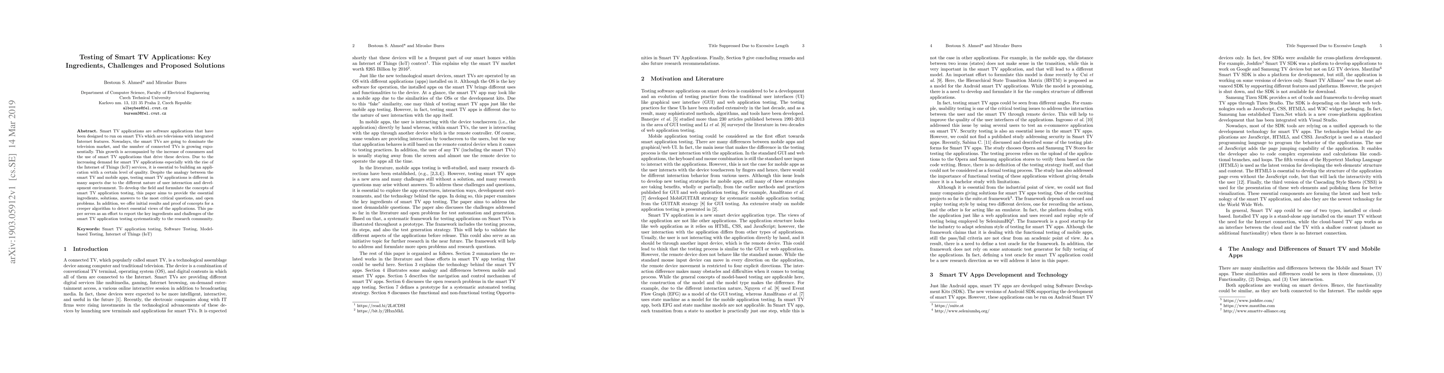 This paper explores the unique challenges and key ingredients in testing smart TV applications, emphasizing the differences in user interaction and development environments compared to mobile apps. It proposes solutions, including a creeper algorithm for detecting essential views, to address these challenges and aims to systematically inform the research community about the field.