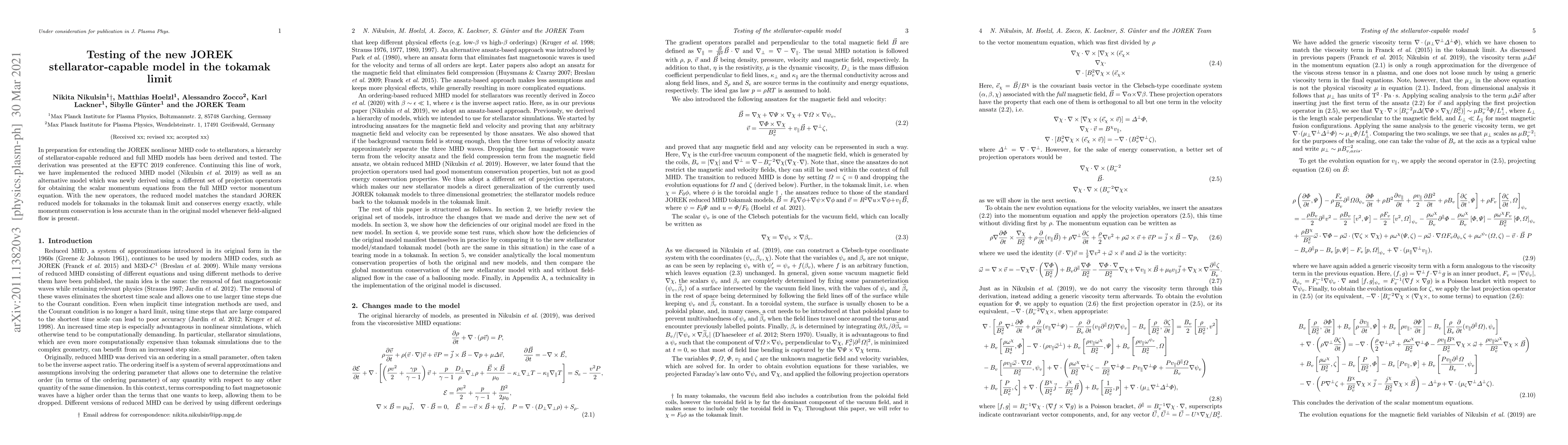 In preparation for extending the JOREK nonlinear MHD code to stellarators, a hierarchy of stellarator-capable reduced and full MHD models has been derived and tested. The derivation was presented at the EFTC 2019 conference. Continuing this line of work, we have implemented the reduced MHD model (arXiv:1907.12486) as well as an alternative model which was newly derived using a different set of projection operators for obtaining the scalar momentum equations from the full MHD vector momentum equation. With the new operators, the reduced model matches the standard JOREK reduced models for tokamaks in the tokamak limit and conserves energy exactly, while momentum conservation is less accurate than in the original model whenever field-aligned flow is present.