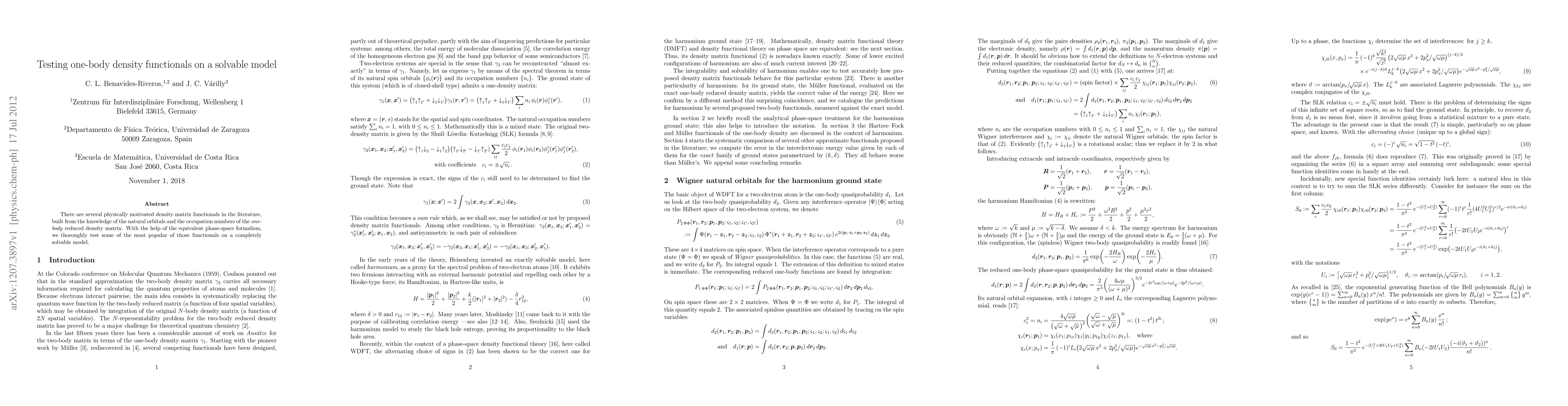 There are several physically motivated density matrix functionals in the literature, built from the knowledge of the natural orbitals and the occupation numbers of the one-body reduced density matrix. With the help of the equivalent phase-space formalism, we thoroughly test some of the most popular of those functionals on a completely solvable model.