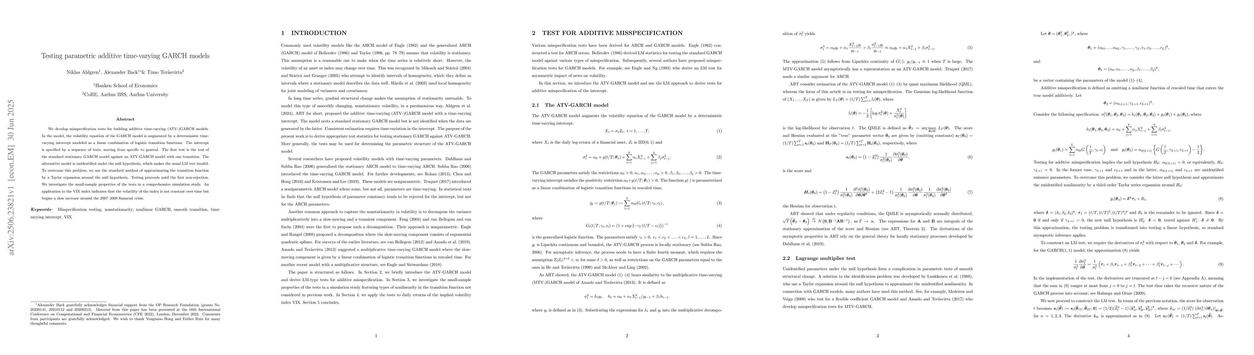 We develop misspecification tests for building additive time-varying (ATV-)GARCH models. In the model, the volatility equation of the GARCH model is augmented by a deterministic time-varying intercept modeled as a linear combination of logistic transition functions. The intercept is specified by a sequence of tests, moving from specific to general. The first test is the test of the standard stationary GARCH model against an ATV-GARCH model with one transition. The alternative model is unidentified under the null hypothesis, which makes the usual LM test invalid. To overcome this problem, we use the standard method of approximating the transition function by a Taylor expansion around the null hypothesis. Testing proceeds until the first non-rejection. We investigate the small-sample properties of the tests in a comprehensive simulation study. An application to the VIX index indicates that the volatility of the index is not constant over time but begins a slow increase around the 2007-2008 financial crisis.